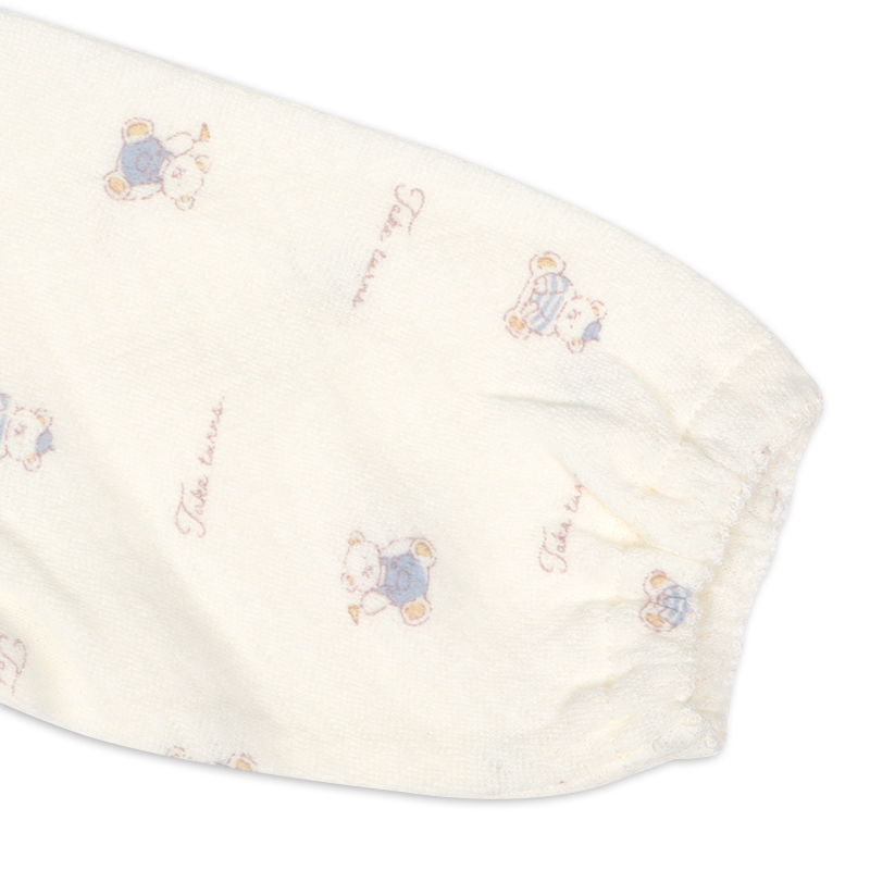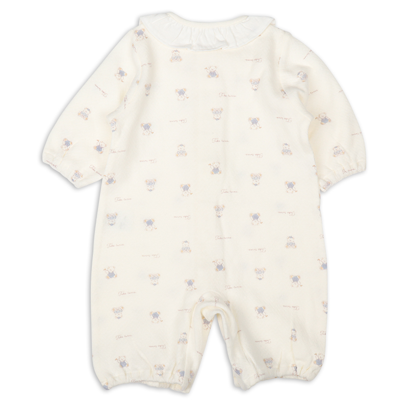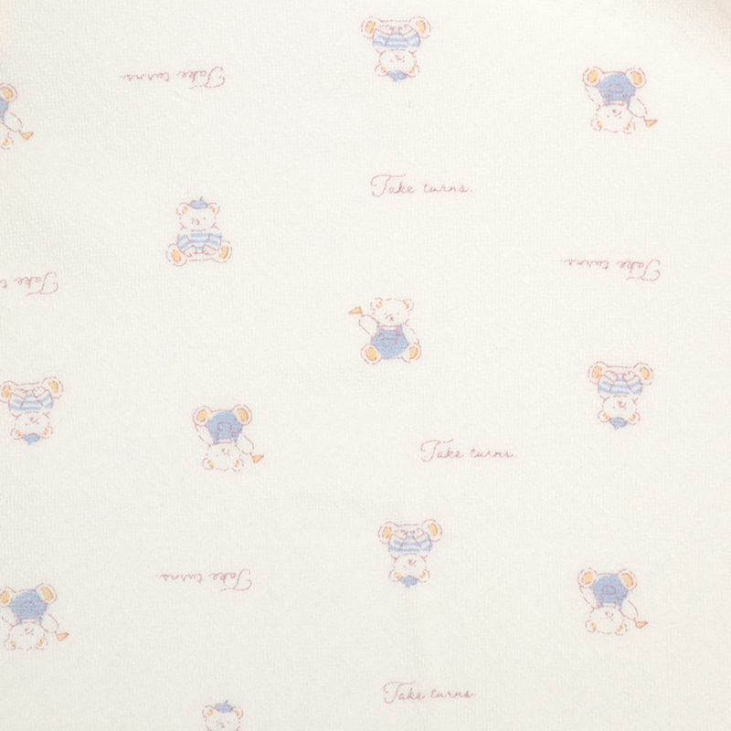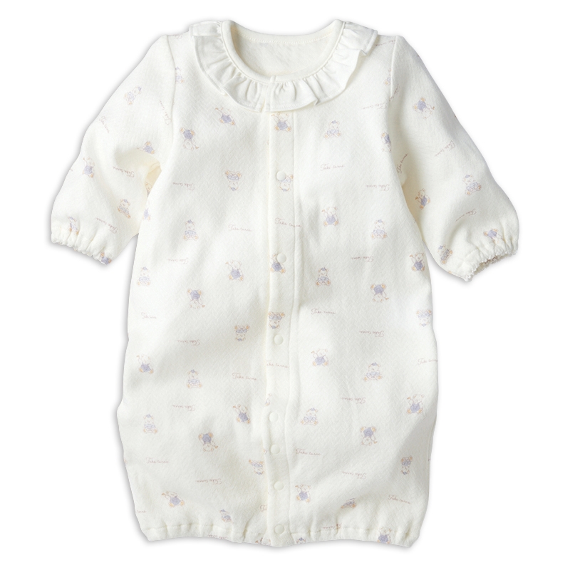 新生児春向け、接結ドレスオールです。 素材は、肌に優しい綿 100% の接結を使用。 やわらかい風合いに仕上げており、まるで包み込むような着心地です。保温性にも優れています。 オフシロ地に可愛いらしいくまの総柄が入った商品です。