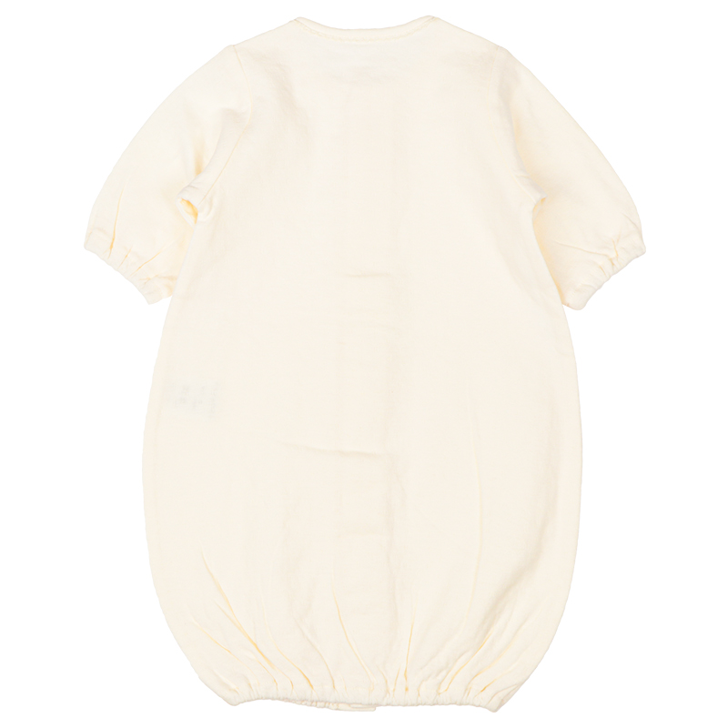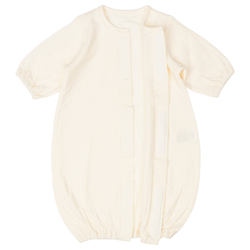新生児春向け、お着替え簡単ドレスオールです。 着脱はマジックテープなのでお着替え簡単。 また使用しているマジックテープの材質はとても柔らかいので、肌に当たっても痛くない安心な商品です。 素材は、肌に優しい綿 100% の接結を使用。 胸元にレースワッペンを付けた、柔らかいベージュ色のシンプル商品です。