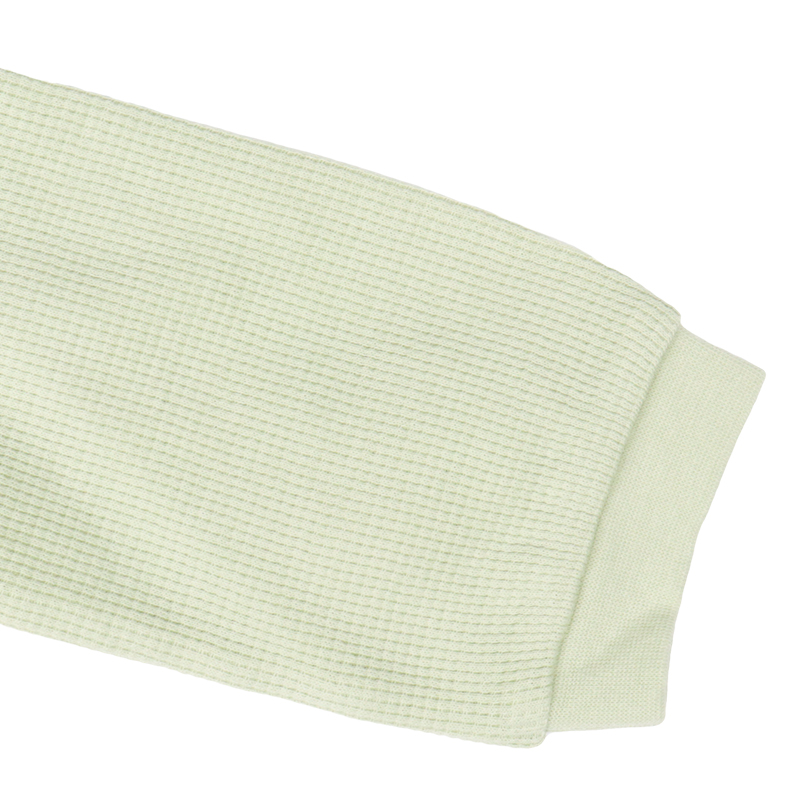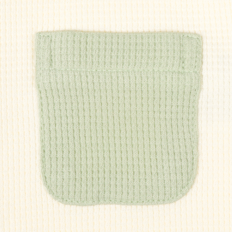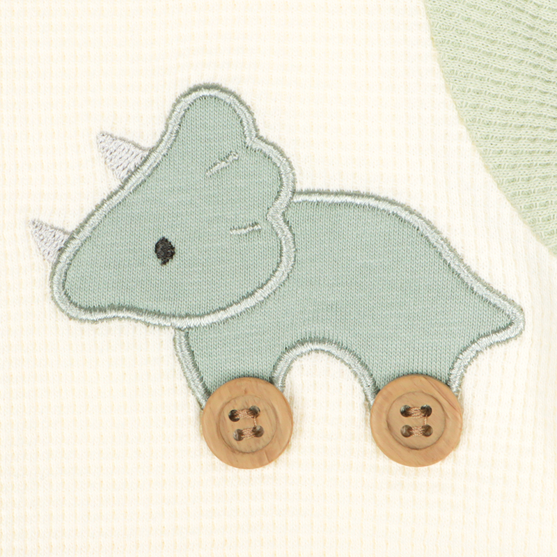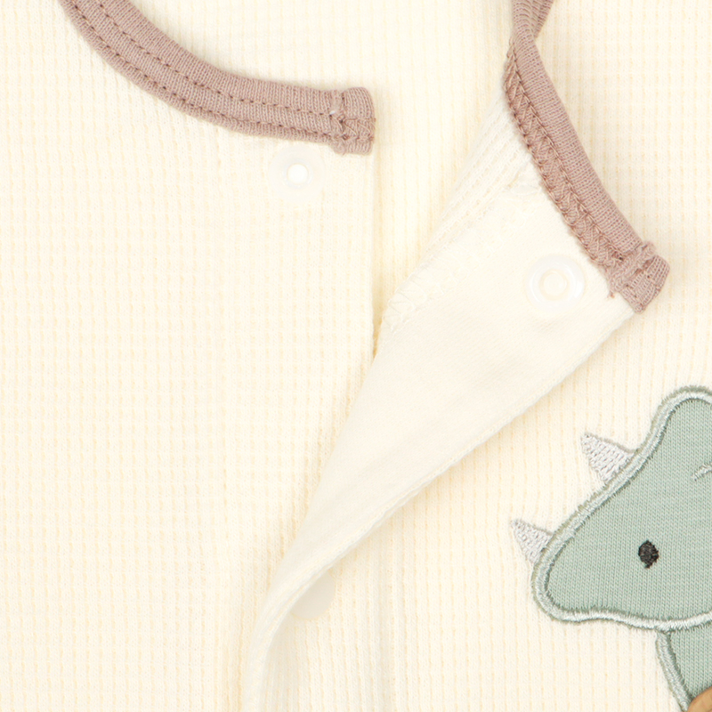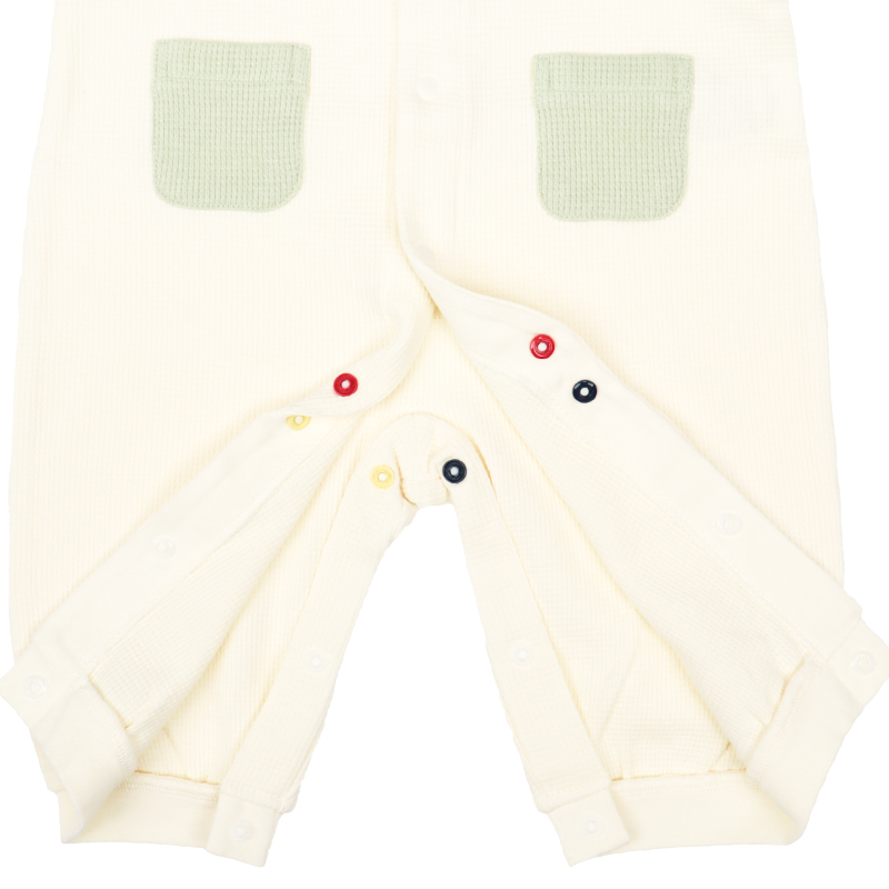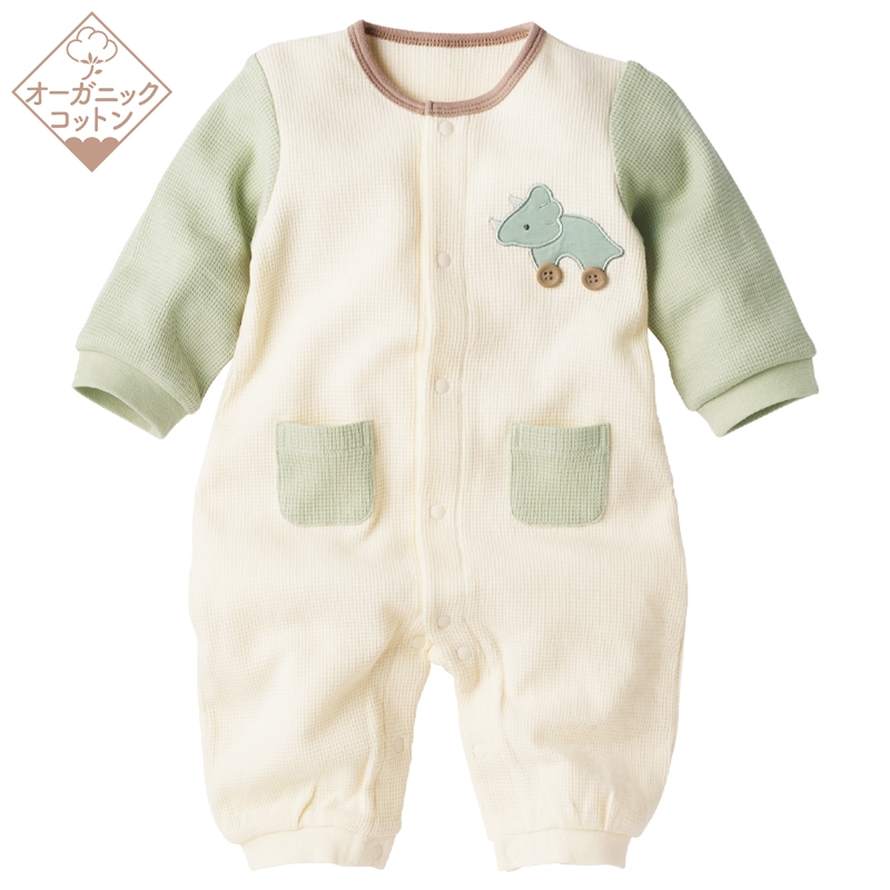 新生児春向け、長袖プレオールです。 身生地は肌に優しいオーガニックコットン100%のワッフル素材を使用。 またお尻はマチ付きで、赤ちゃんの足にフィットするようにカエル足仕様になっています。 胸元に恐竜のワンポイント刺繍と両脇ポケットが付いた、シロXミント色のシンプルな商品です。