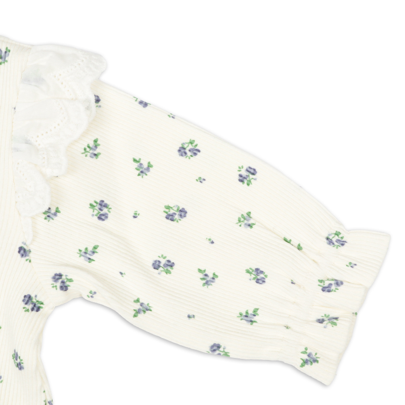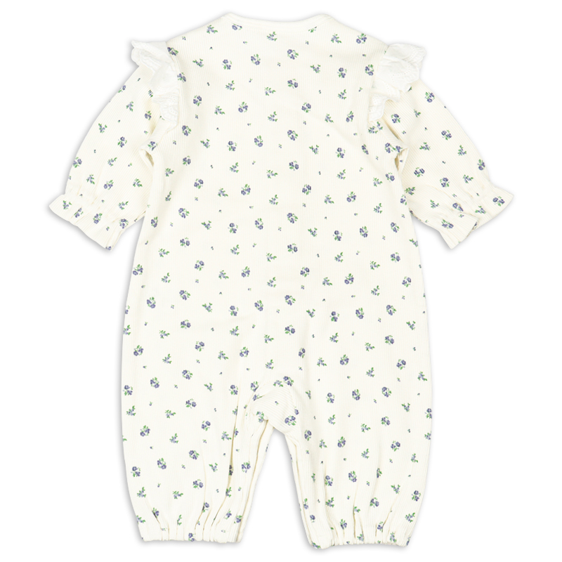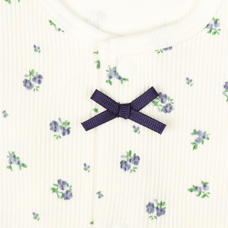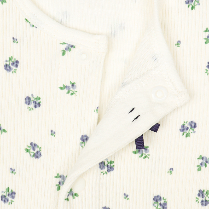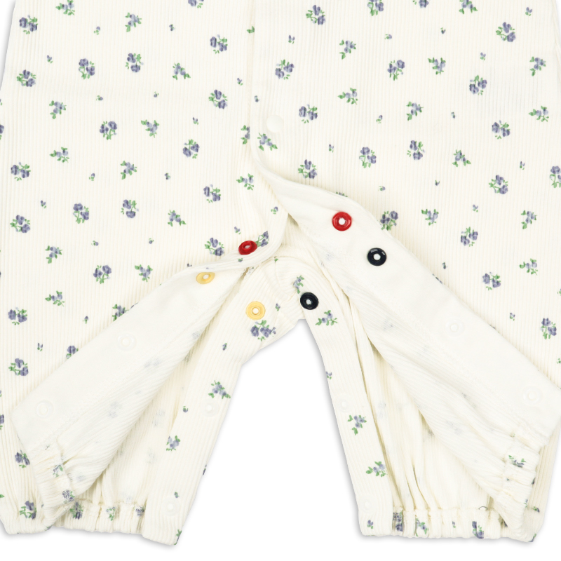 新生児春向け、長袖プレオールです。 身生地は肌に優しいオーガニックコットン100%のワッフル素材を使用。 またお尻はマチ付きで、赤ちゃんの足にフィットするようにカエル足仕様になっています。 柔らかいアイボリー地に小花総柄のシンプルな商品です。