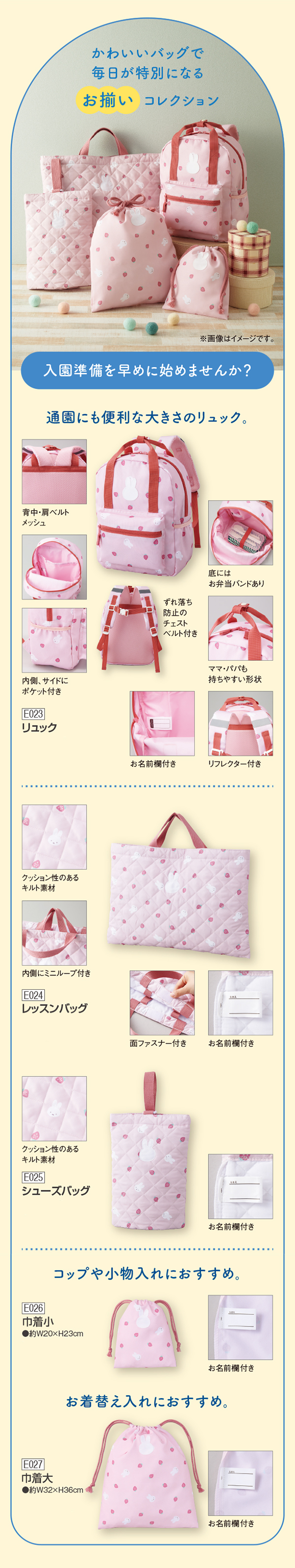 持ち手をDカンに通す簡単な仕様で、中身が飛び出しにくいです。 同じ柄の巾着・レッスンバッグと揃えていただけます。 内側にお名前記入用タグ付き。 〇洗濯について この製品は、染め及びプリントの性質上、 摩擦、水濡れ等により若干色落ちすることがありますのでご注意ください。 洗濯する場合は手洗いし、もみ洗い、漂白剤はお避けください。 洗濯により製品が若干縮む場合があります。
