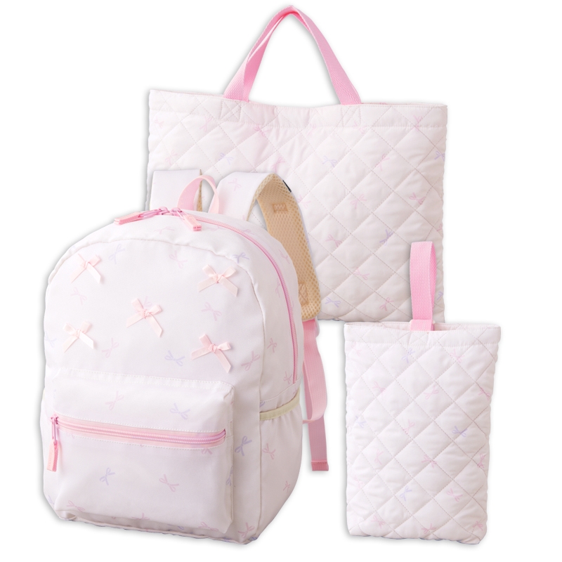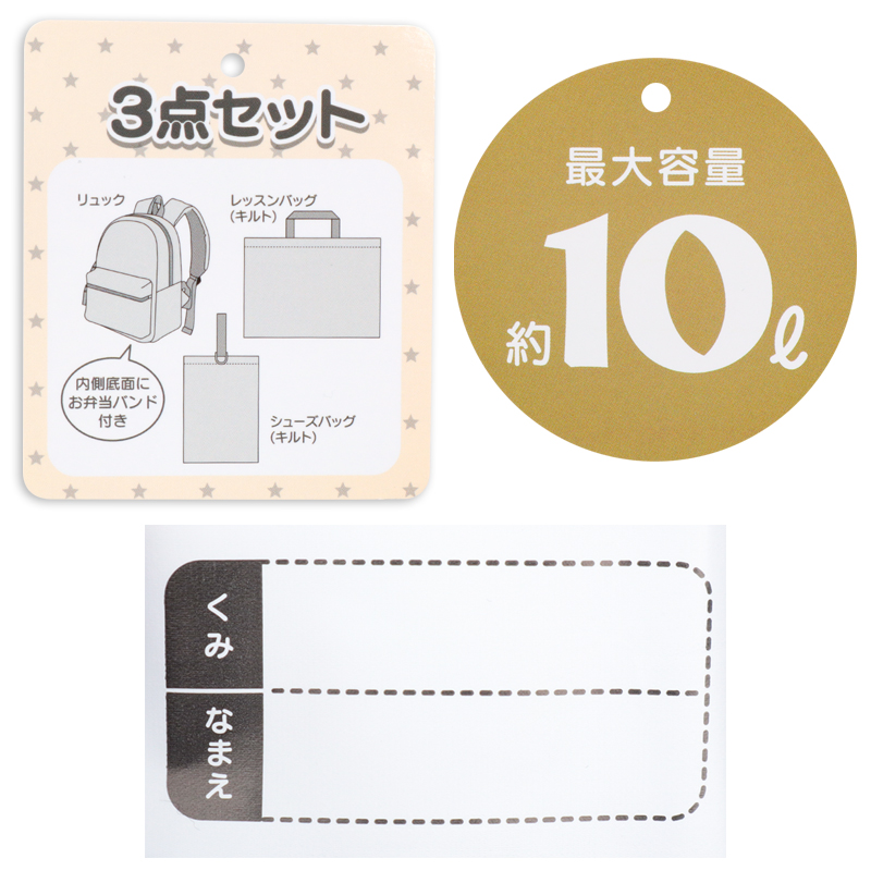 ●リュックサック ・素材:ポリエステル ・サイズ: 約W23×H31×D13cm ・肩ベルト・チェストベルトは調節可能です。 ・お名前タグ付き ●レッスンバッグ ・素材:ポリエステル(キルティング生地) ・約W41×H29cm ・フック用ループ・お名前タグ付き ●シューズバッグ ・素材:ポリエステル(キルティング生地) ・サイズ:約W22×H28×D4cm ・お名前タグ付き