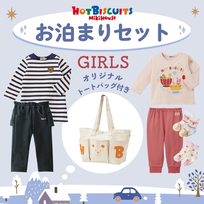 ★ホットビスケッツお泊まりセット★ ミキハウス ホットビスケッツからお泊まりにぴったりなお得なセットが登場! 秋冬春にたくさん着ていただけるウエアとルームウェア、ソックス、トートバッグがセットになっています。 〈セット内容〉 ■グリーン ・ルームウェア 通園用にも便利な上下セットのルームウェア。 パジャマ代わりや園でのお着替え用にとお着替えの枚数が必要なお子さまにぴったり◎ ・Tシャツ ロゴワッペンがポイントのボーダー長袖Tシャツ。 合わせやすいカラーで、デイリーカジュアルにピッタリな定番アイテム。 スタイリングのメインとしても活躍します。 ・パンツ 人気の顔ドンシリーズのスウェットパンツ。 両サイドのポケットモチーフがかわいく、やわらかな肌触りで吸水性に優れた裏毛パイル素材。 裾部分がリブ仕様なので裾がダブつくことなく、スッキリした印象で履いていただけます。 ・ソックスパック クルーソックス2足セット。 ■ピンク ・ルームウェア 通園用にも便利な上下セットのルームウェア。 パジャマ代わりや園でのお着替え用にとお着替えの枚数が必要なお子さまにぴったり◎ ・ワンピース ボートネックの重ね着風デザインがかわいいワンピース。 合わせやすいカラーで、デイリーカジュアルにピッタリな定番アイテム。 ・パンツ ホットビスケッツの定番 ストレッチデニムパンツ。 すっきりとしたシルエットなのでどんな形のトップスと合わせても相性ばっちり◎ おしりのフリルでバックスタイルまでかわいくきまります。 ・ソックスパック クルーソックス2足セット。 ※オリジナルトートバッグ付き(デザインは共通です) W48×H28×D16cm 外側にポケットがついた便利なガーデンバッグ。 パパやママも使いやすいサイズでおでかけやご旅行にもぴったりです! ※中身の商品にはプライスの記載したタグが付いております。 ※素材・原産国・洗濯表記は、商品に付いているケアラベル・縫付けタグをご覧ください。 ※商品不良以外のキャンセル・返品交換はお断りいたします。 ※数量限定につき、売り切れ次第販売終了とさせていただきます。 ※ラッピングを承ることができません。値札が付いた状態でのお届けになります。