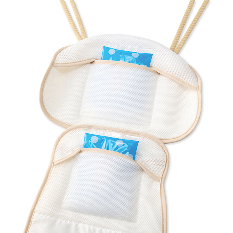 ●サイズ(約・cm):高さ73×巾37 ●素材: [本体・天竺]ナイロン50%・ポリエチレン50% [中わた・ポリエステルわた]ポリエステル100% [裏地・立体構造メッシュ]ポリエステル100% ●セット内容:本体・保冷剤2個 ※手絞りの場合は弱く、水洗いは中性洗剤を使用して下さい。