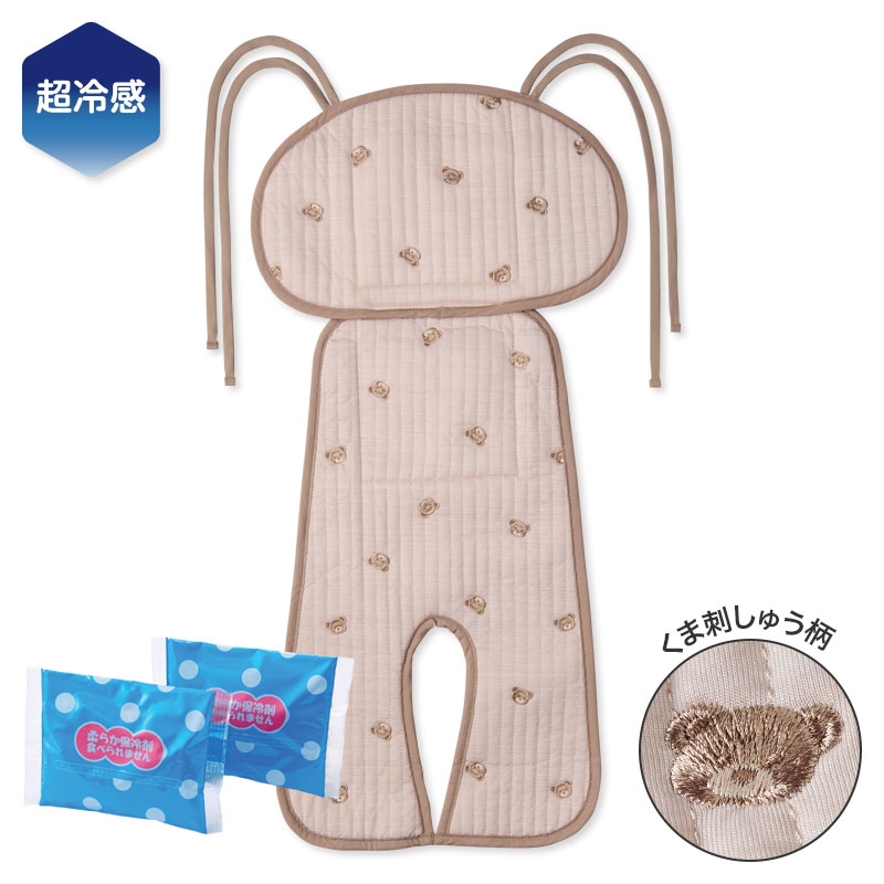 更に冷たい超冷感素材を使用した日本製ジェル3個付きベビーカーシート。 更に冷たい超冷感素材を使用したベビーカーシート。 日本製保冷剤がセットできて夏のお出かけで暑さを和らげます。 保冷剤は取り外しができ、なしでも使用できます。 表面の素材は接触冷感機能があります。 また、裏地は立体メッシュを使用、熱のこもりやすい背中の通気性を キープできるような設計になっています。 かわいいクマ刺繍デザインです。