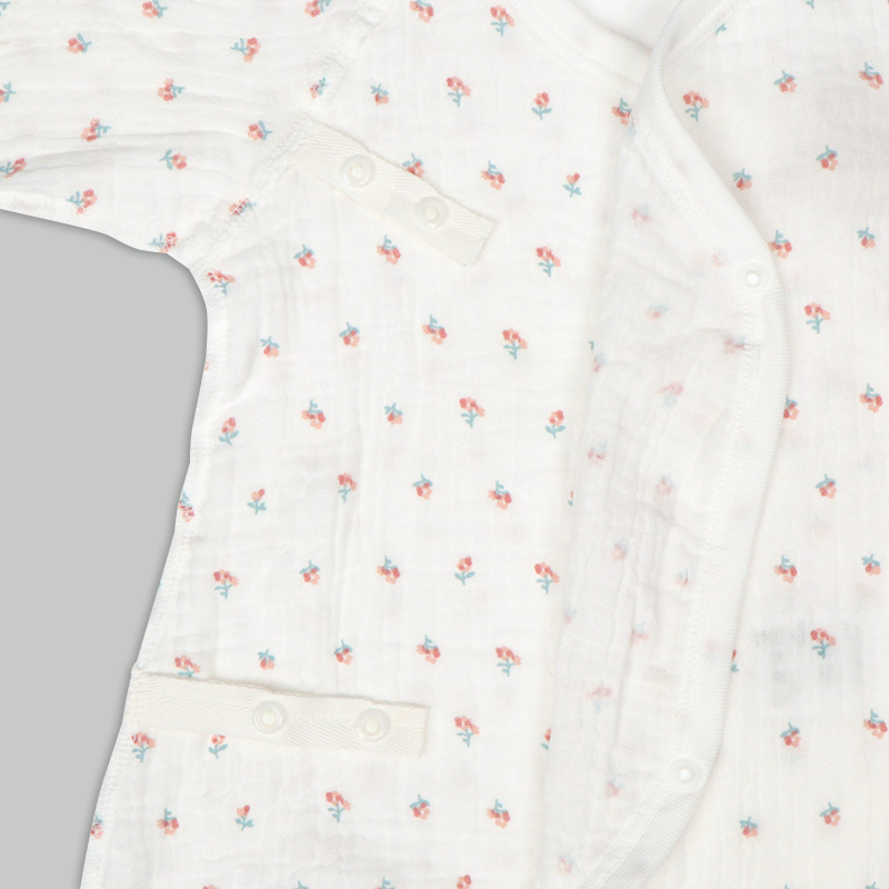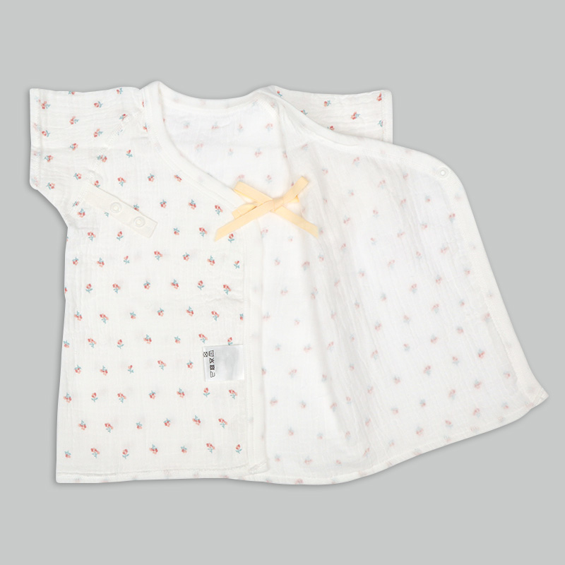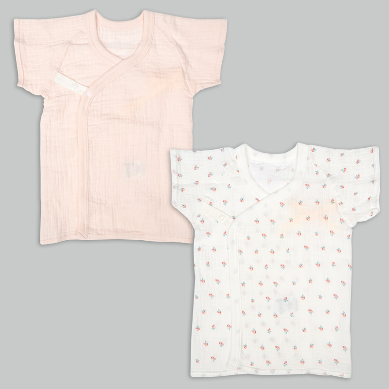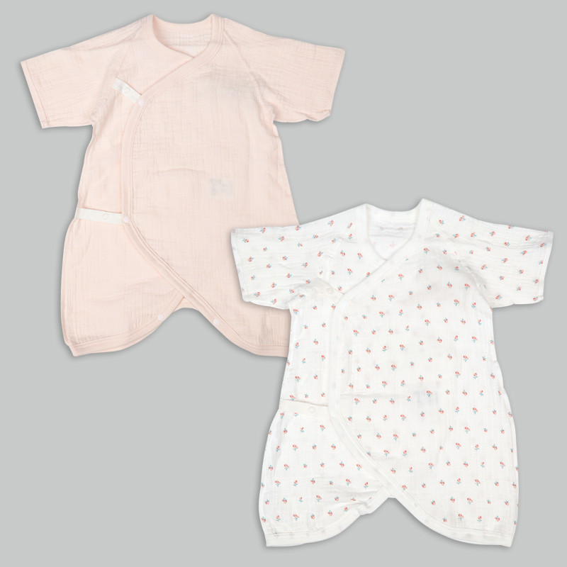 赤ちゃんに必要な基本アイテムを揃えた肌着セット。短肌着は保温しながら汗を吸収し、清潔さをキープします。コンビ肌着は内側スナップで裾がはだけにくく、外側はスナップ、内側はひもで調節可能。綿100%ガーゼ素材と外縫い仕様で、肌にやさしい着心地です。