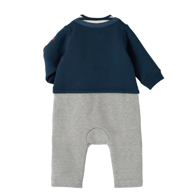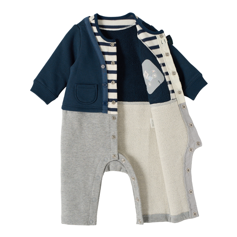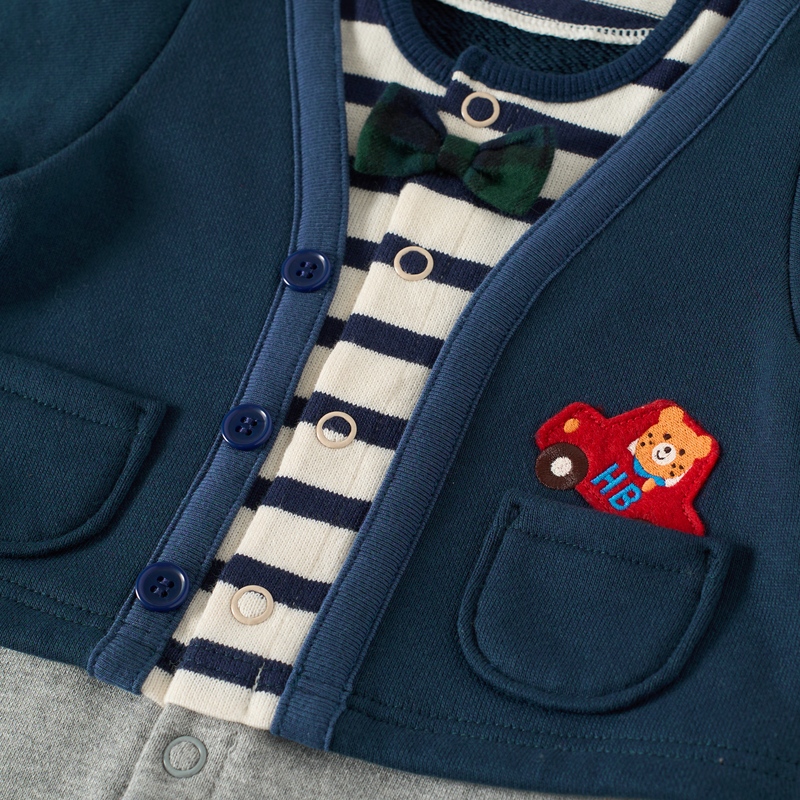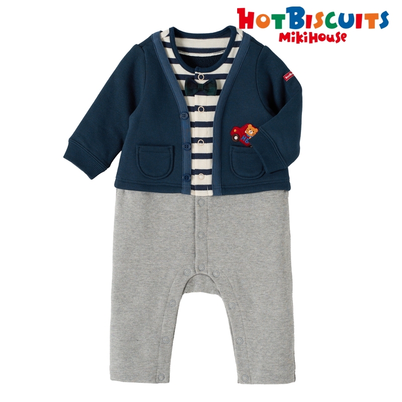 ミキハウス ホットビスケッツのカバーオール(ロンパース)。 カーディガンを羽織ったような、重ね着風のカバーオールです。 胸元の蝶ネクタイとポケットのビーンズワッペンがポイント! [素材感] カーディガン、パンツ部分はあたたかくやわらかな肌触りで吸湿性に優れた裏毛パイル素材。 ボーダー部分は、少し肉厚で肌触りや通気性がよい天竺素材。 ……………………………………… 伸縮性:あり 生地:綿100%、少し厚め 袖丈:長袖 おすすめ着用シーズン:秋冬 ……………………………………… ●前ホックで股下まで全開するので、お着替えやオムツ替えも便利 ●お尻はゆったりマチつきで、活発なお子さまの動きを妨げません 《HOT BISCUITS ーホットビスケッツー》 ミキハウスホットビスケッツは、”Good Quality”がキーワードのブランド。 子どもたちには毎日ごきげんに、楽しく健やかに 過ごしてほしいから、 お子さまのための良いものづくりを大切にしています。 男の子も女の子も子どもらしく、おしゃれに可愛く着られるアイテムがいっぱい。 赤ちゃんからキッズまでの子ども服・ベビー服・ベビー用品等を幅広くご用意しています。 春夏秋冬の季節に合わせた、ご出産祝いやプレゼント、ギフトもおすすめです。