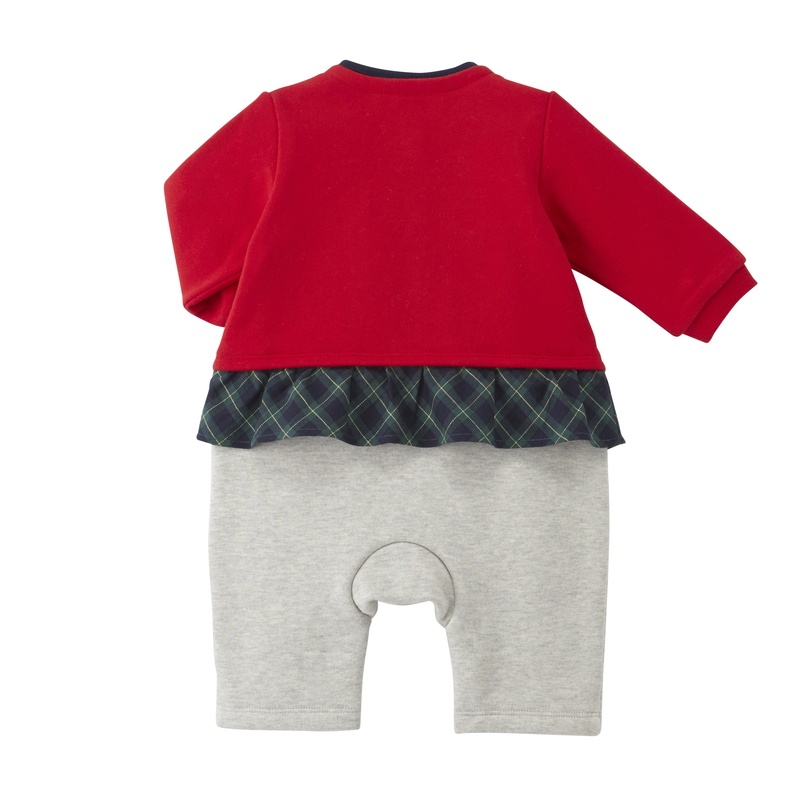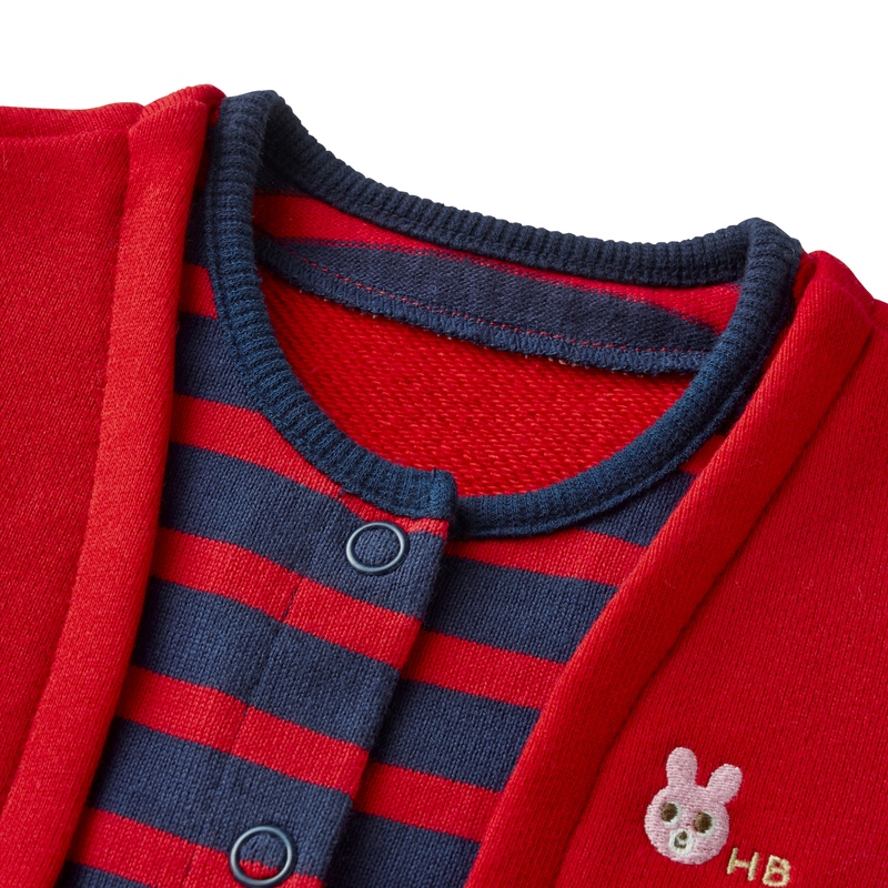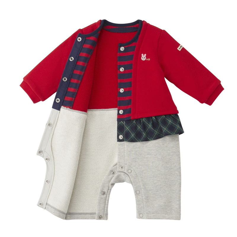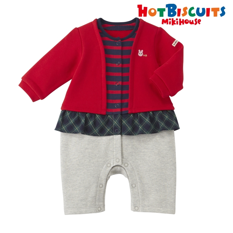 ミキハウス ホットビスケッツの7分丈カバーオール(ロンパース)。 カーディガンを羽織ったような、重ね着風のカバーオールです。 チェック柄の裾フリルがかわいいデザイン。 股下は7分丈になっているので、少し大きめでも着ていただきやすく ソックスなどで足元のオシャレも楽しめます。 [素材感] カーディガン、パンツ部分はあたたかくやわらかな肌触りで吸湿性に優れた裏毛パイル素材。 ボーダー部分は、少し肉厚で肌触りや通気性がよい天竺素材。 ……………………………………… 伸縮性:あり 生地:綿100%、少し厚め 袖丈:長袖 おすすめ着用シーズン:秋冬 ……………………………………… ●前ホックで股下まで全開するので、お着替えやオムツ替えも便利 ●お尻はゆったりマチつきで、活発なお子さまの動きを妨げません 《HOT BISCUITS ーホットビスケッツー》 ミキハウスホットビスケッツは、”Good Quality”がキーワードのブランド。 子どもたちには毎日ごきげんに、楽しく健やかに 過ごしてほしいから、 お子さまのための良いものづくりを大切にしています。 男の子も女の子も子どもらしく、おしゃれに可愛く着られるアイテムがいっぱい。 赤ちゃんからキッズまでの子ども服・ベビー服・ベビー用品等を幅広くご用意しています。 春夏秋冬の季節に合わせた、ご出産祝いやプレゼント、ギフトもおすすめです。