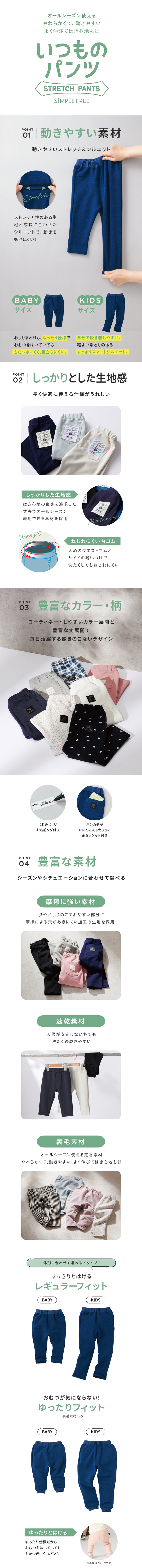 綿56%ポリエステル38%ポリウレタン6% 【100cm】ウエスト44ヒップ58.5総丈57 【110cm】ウエスト46ヒップ62.2総丈63 【120cm】ウエスト48ヒップ66総丈69 【130cm】ウエスト50ヒップ70総丈75