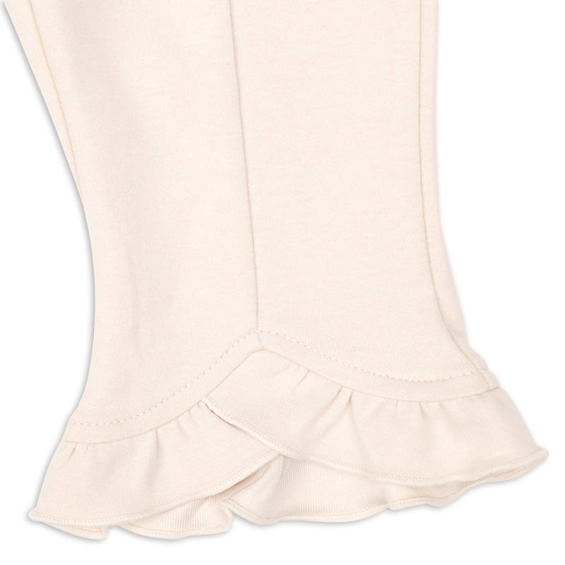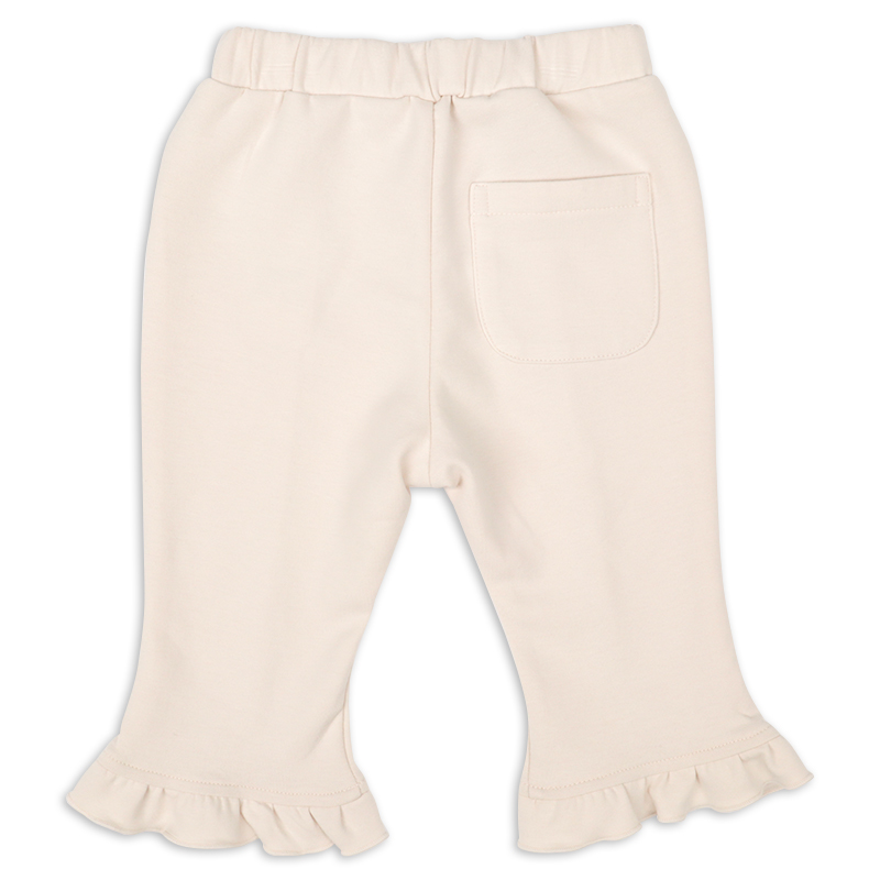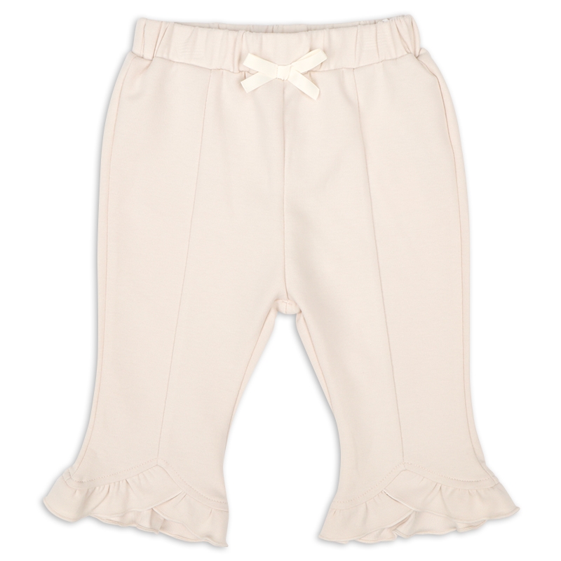 すっきりとしたシルエットと裾のフリルがおしゃれなパンツです。 10分丈のロングパンツより、少し短めの8分丈なので、裾のもたつきなく着用できます。 表面が滑らかで、伸縮性のある生地を使用しました。 着合わせがしやすいベーシックなカラーで、コーディネイトの巾も広がります。 名前が書けるお名前タグ付きです。