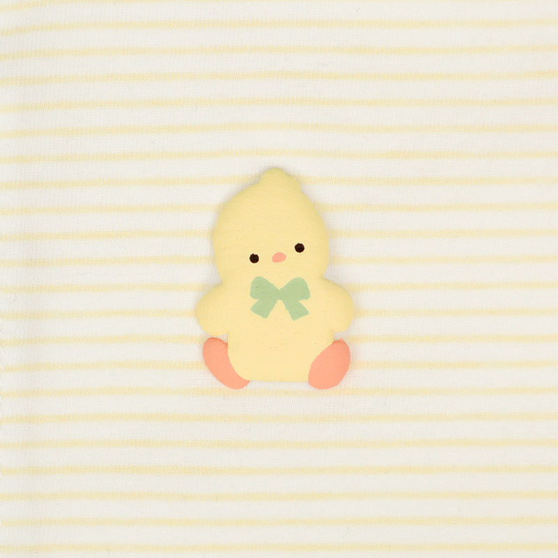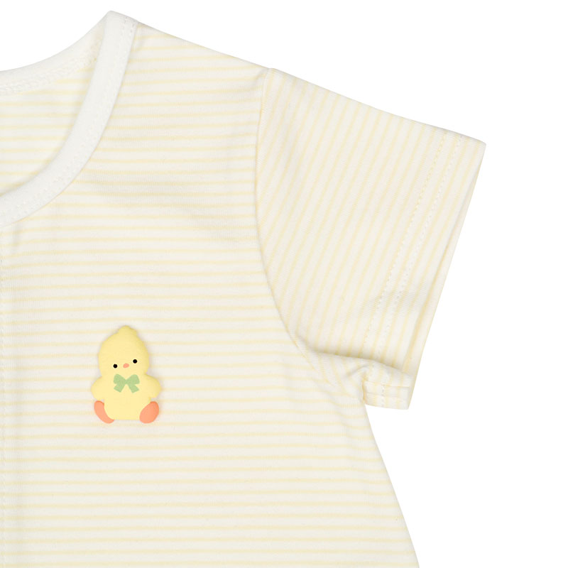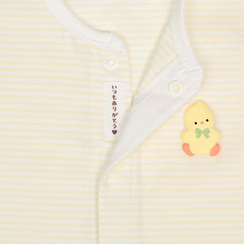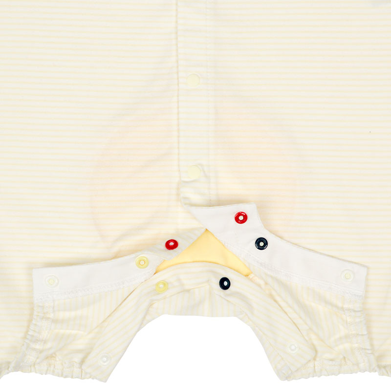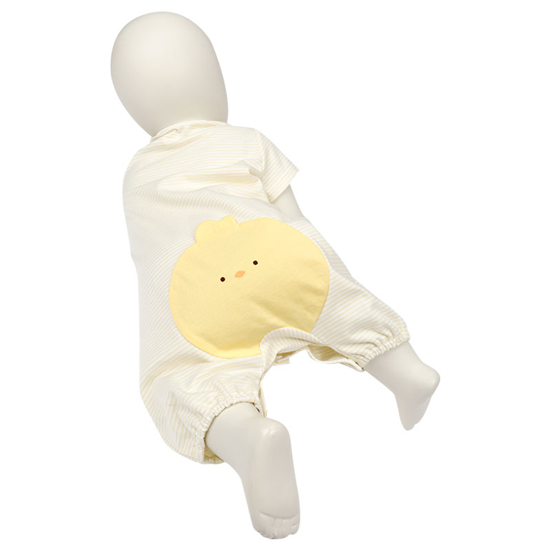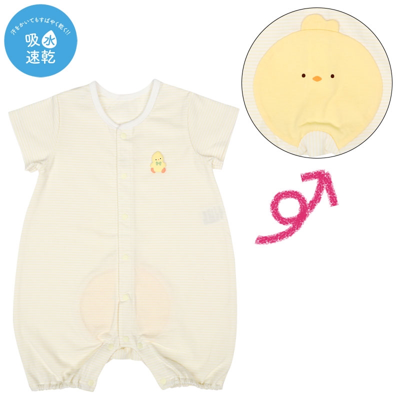 ●素材=本体:綿57%ポリエステル38%ポリウレタン5% 見返し:綿100% おしり部分:綿100% ●サイズ(約・cm)= 60(身丈42・身幅26・袖丈7.5) 70(身丈45・身幅27・袖丈8) 80(身丈48・身幅28・袖丈8.5)