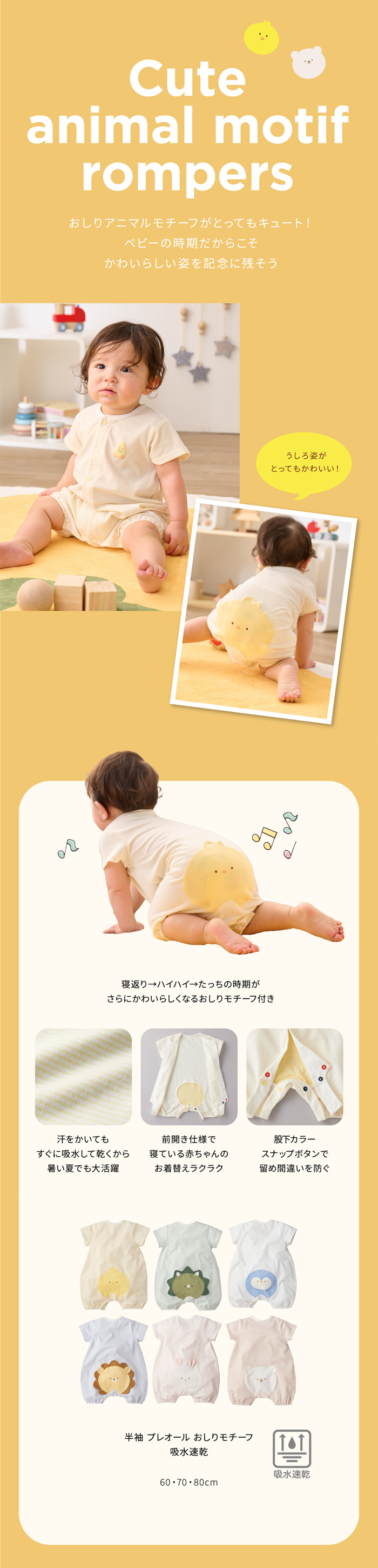 汗をかいてもすぐに乾く吸水速乾。 ハイハイしている姿がますます可愛く見えるよう、おしりのマチ部分にかわいい動物がデザインされています。 とめまちがい防止のため、股下ボタンのカラーを変えているので、お着替えも簡単。 前開き+股下スナップで寝ている赤ちゃんのお着替えやおむつ替えがラクラクです。