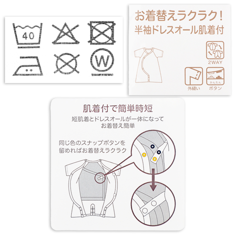 そこで、肌着とドレスオールを一体にし、1枚でお着がえができる肌着付きドレスオールがとっても便利です。
