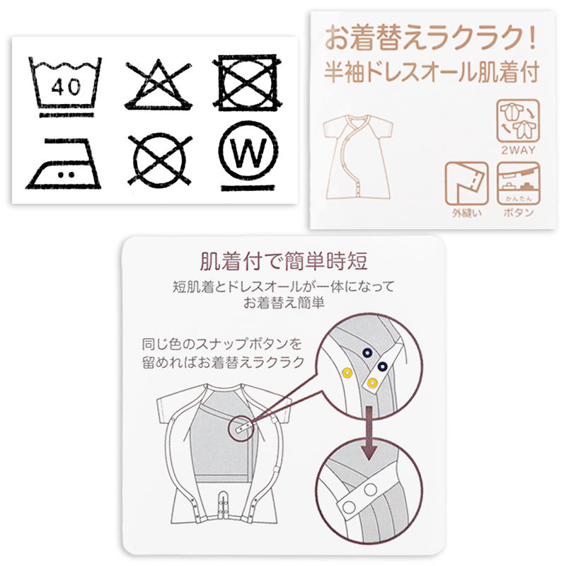 足の動きが活発になった赤ちゃんをあやしながら、お着がえをさせるのは大変。 そこで、肌着とドレスオールを一体にし、1枚でお着がえができる肌着付きドレスオールがとっても便利です。 新生児期はドレスオールとして使用、足を頻繁に動かすようになったら足部分が分かれたプレオールとしても使えます。