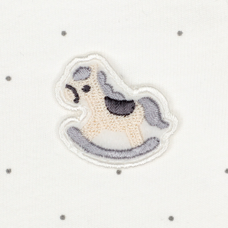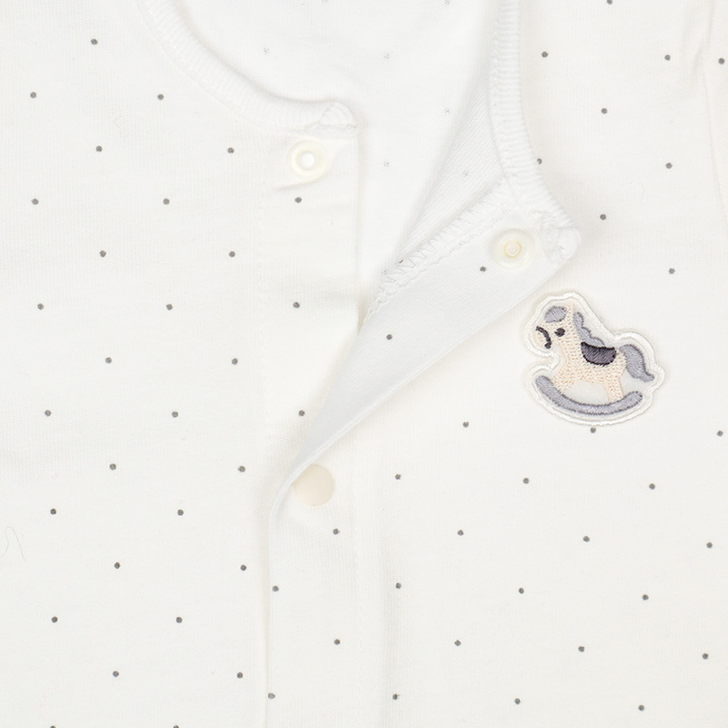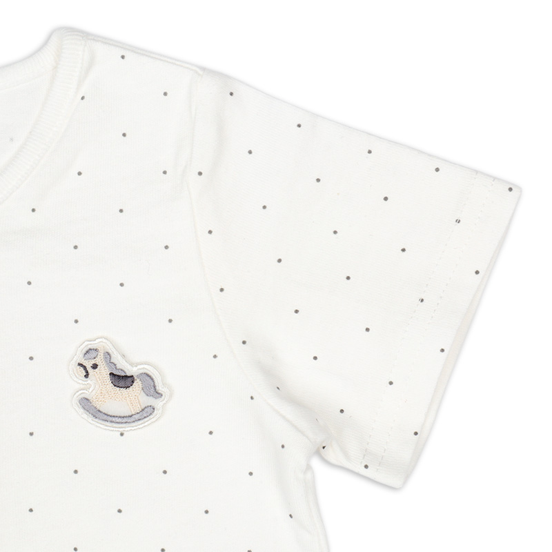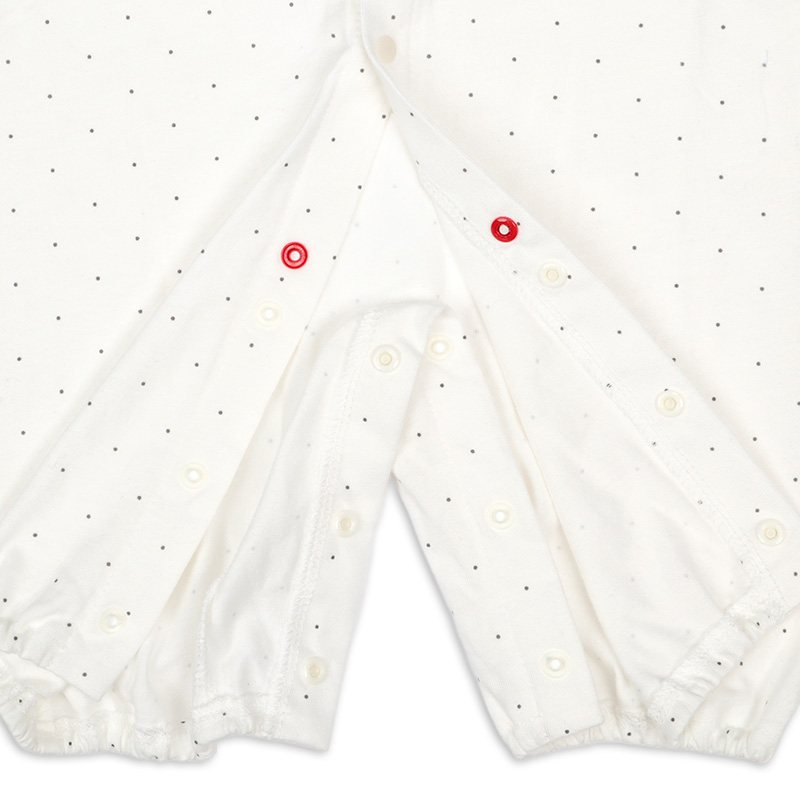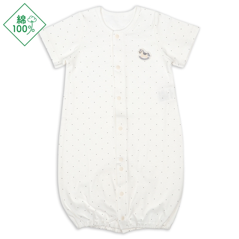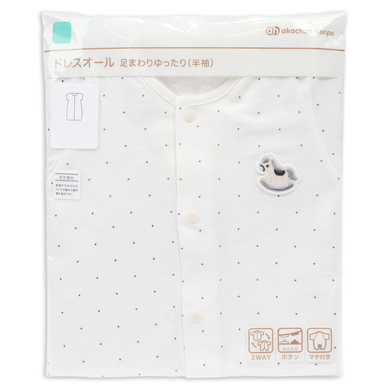 伸縮性のある生地の半袖ドレスオールです。 ドレスオールは、股下ボタンをプレオール仕様にすることができるツーウェイで、足の動きが活発になってきてもお洋服がめくりあがりません。 マチ付きなので足まわりがゆったりしています。