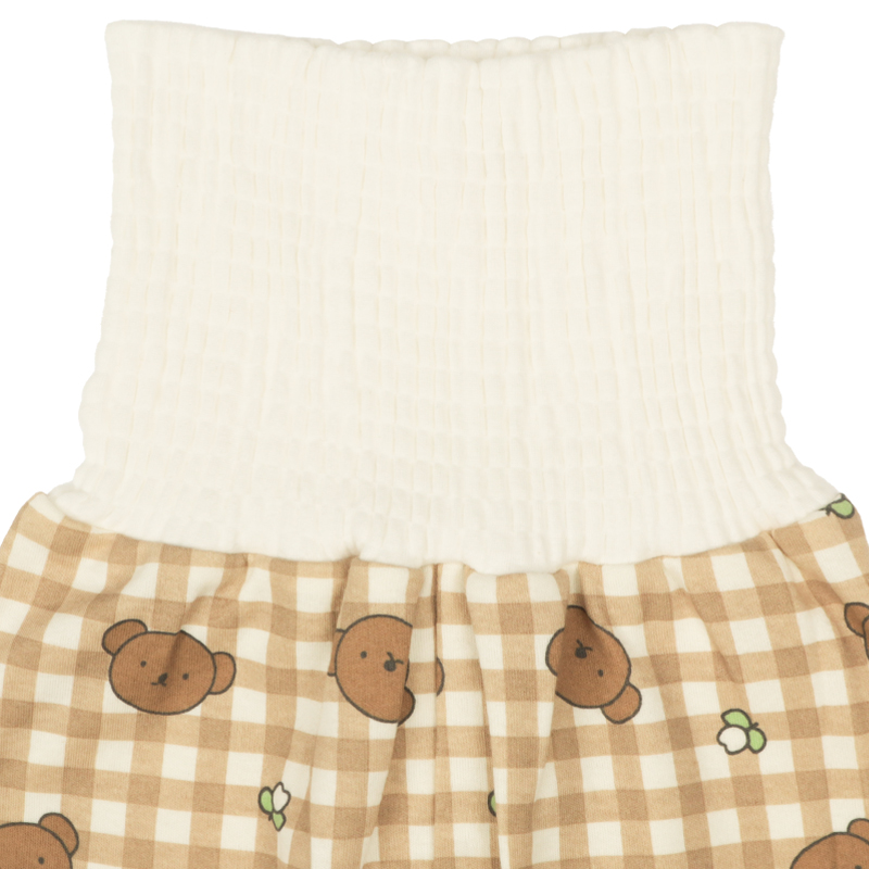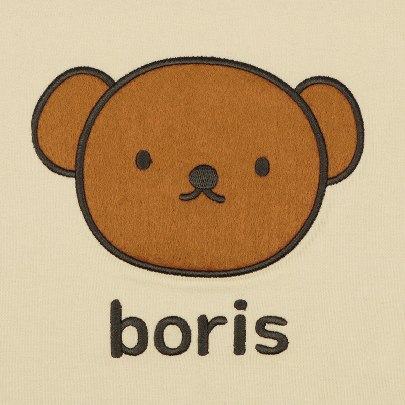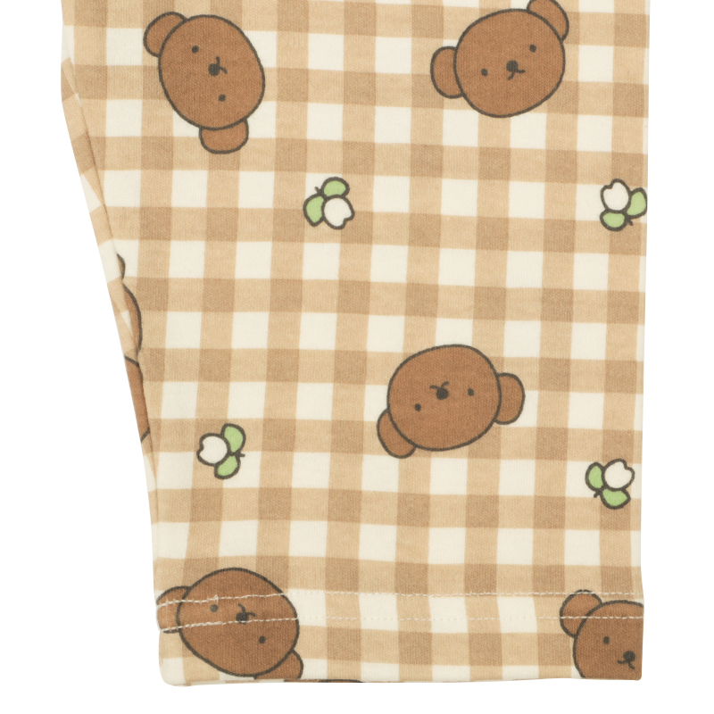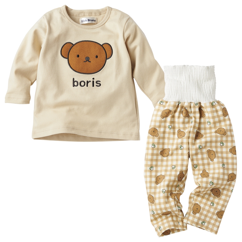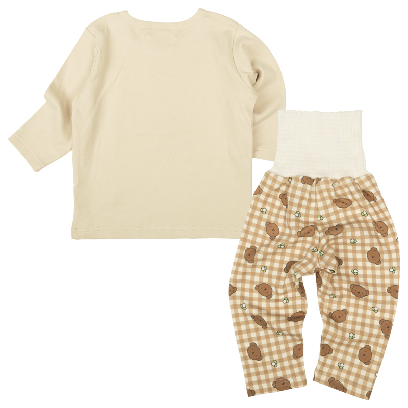 綿100%スムース素材で着心地の良い上下セットパジャマ。トップスにはキャラ顔のアップリケ刺繍、後首ぐりゴム入り。パンツにはキャラと果物やお花の総柄がかわいらしいデザイン。マタニティパジャマとデザインがリンクしているのでママとのリンクコーデもおすすめ。