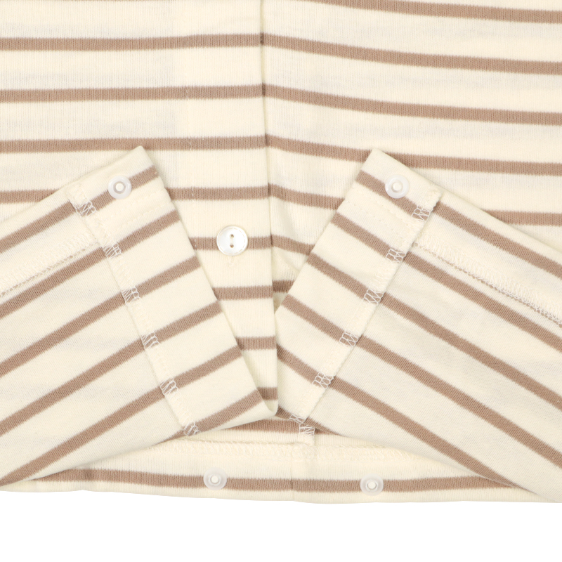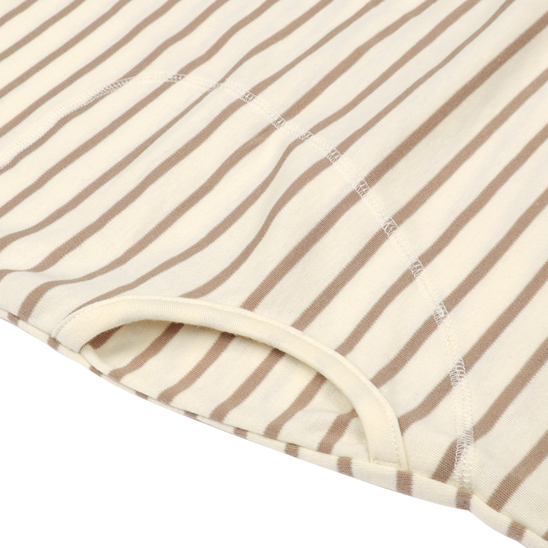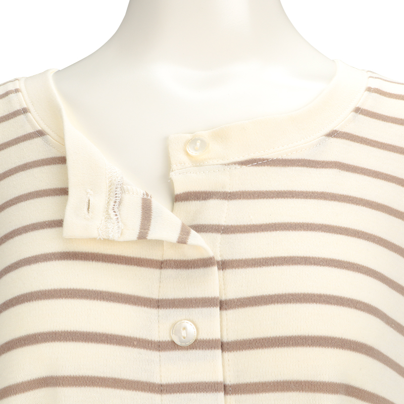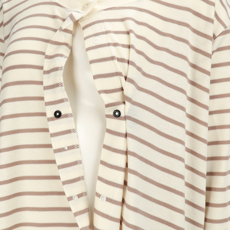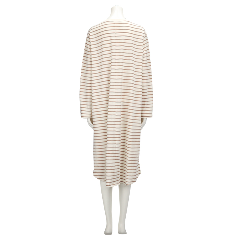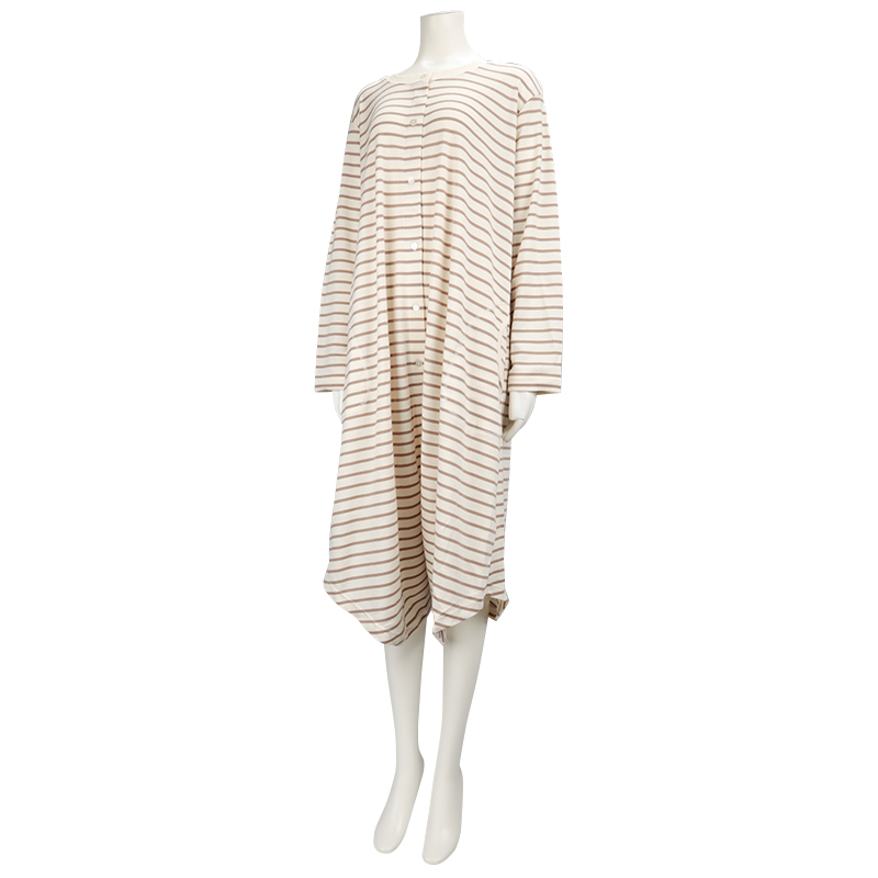 ●素材=ポリエステル65% 綿35% ●洗濯表示=液温は40℃を限度とし洗濯機で弱い洗濯処理ができる。漂白処理はできない。タンブル乾燥はできない。日陰でのつり干し乾燥がよい。底面温度120℃を限度としてアイロン仕上げができる。ドライクリーニング処理ができない。弱い処理でのウエットクリーニング処理ができる。 ●サイズスペック= MーL 身幅53.5 丈110 肩線42.3 袖丈55 袖口13 ●対象期間=産前~産後