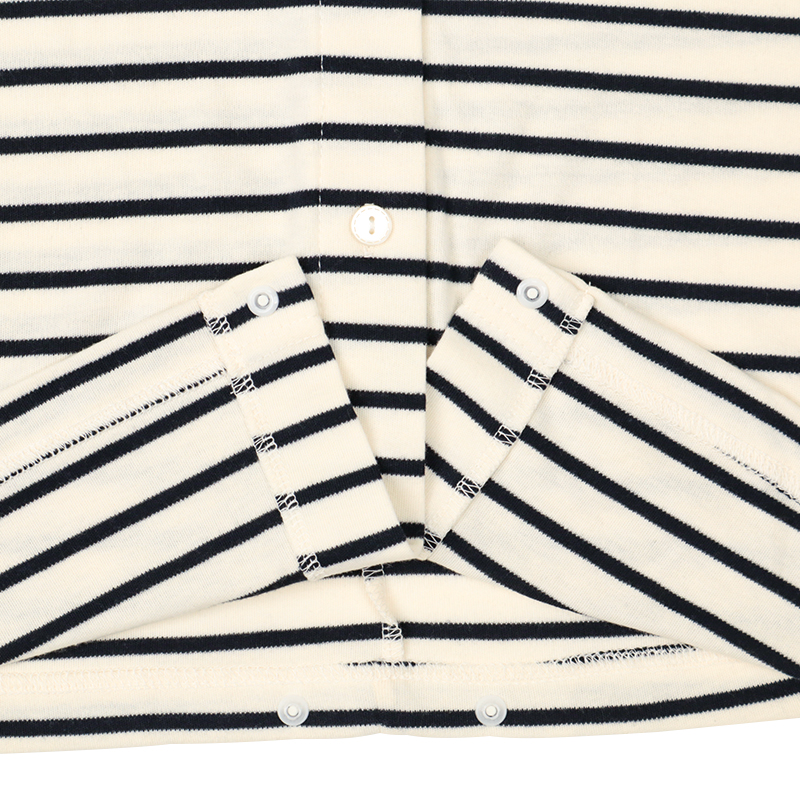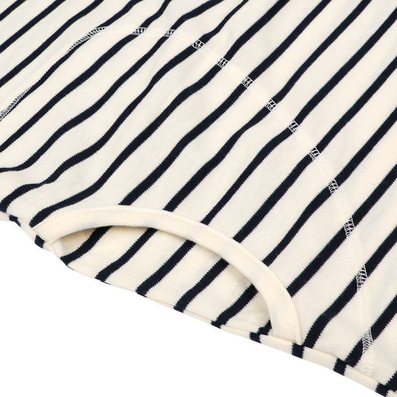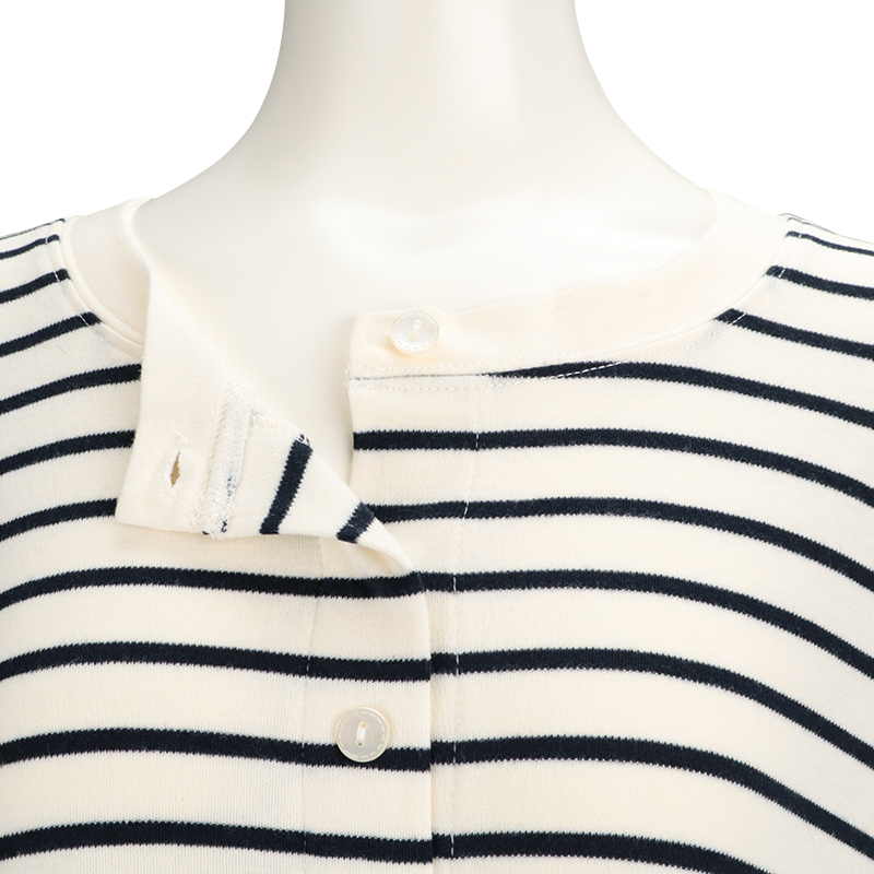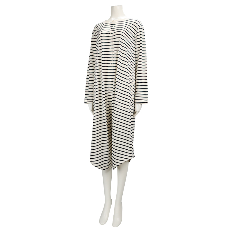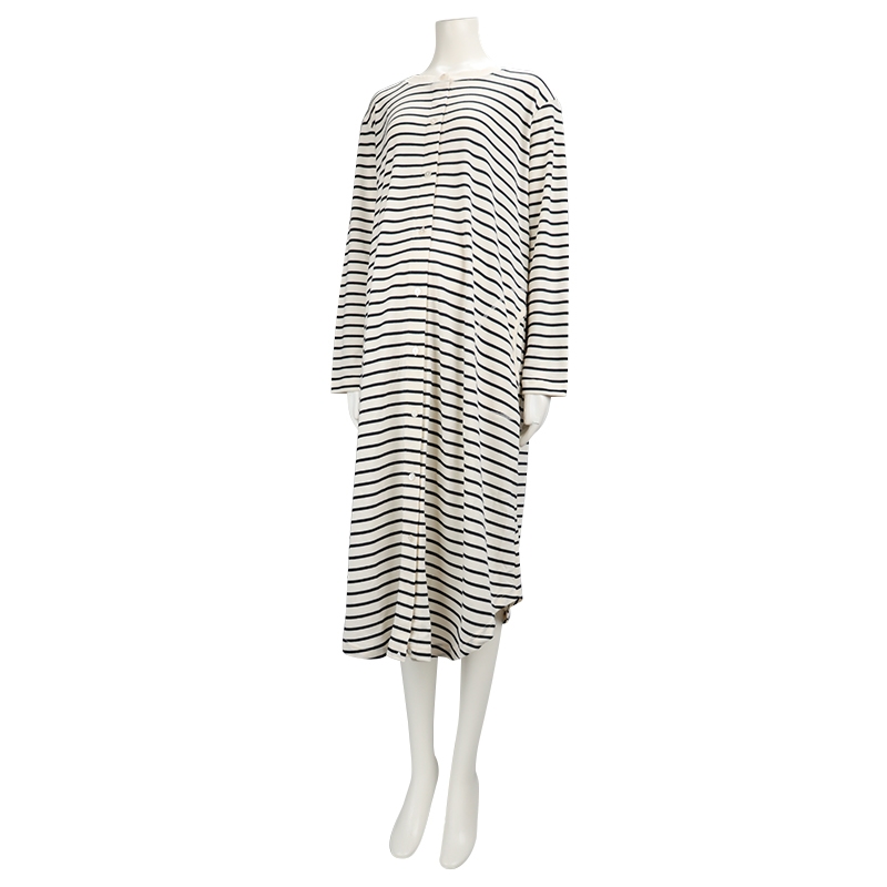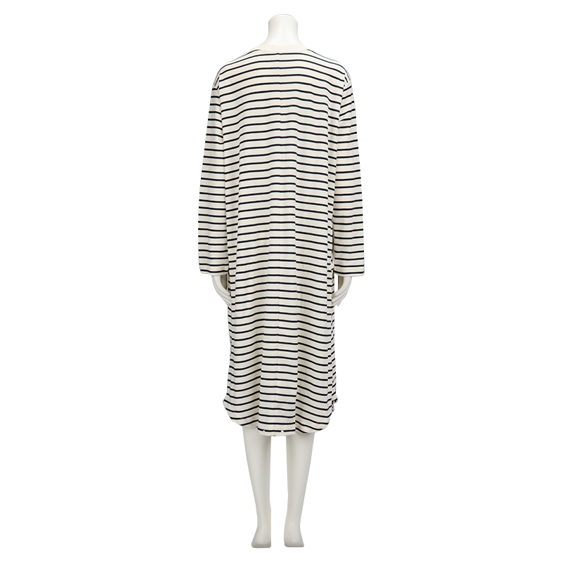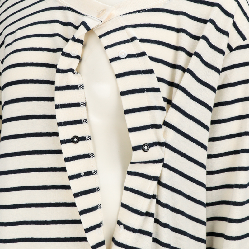●素材=ポリエステル65% 綿35% ●洗濯表示=液温は40℃を限度とし洗濯機で弱い洗濯処理ができる。漂白処理はできない。タンブル乾燥はできない。日陰でのつり干し乾燥がよい。底面温度120℃を限度としてアイロン仕上げができる。ドライクリーニング処理ができない。弱い処理でのウエットクリーニング処理ができる。 ●サイズスペック= MーL 身幅53.5 丈110 肩線42.3 袖丈55 袖口13 ●対象期間=産前~産後