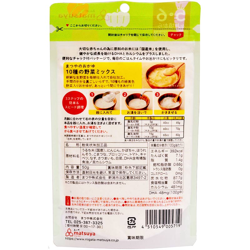 ●内容量:50g (袋込み総重量58g) 製品一袋で約10食分(月齢目安5~6ヶ月の場合) ●原材料:うるち米(国産)、にんじん、かぼちゃ、ほうれんそう、こまつな、ブロッコリー、トマト、キャベツ、なす、さつまいも、白菜、DHA含有精製魚油/貝カルシウム ・保存に便利なスタンドチャック袋 ・保存料不使用 ・pH調整剤不使用 ・酸化防止剤不使用 ・無香料、無着色 ・アレルゲン28品目不使用 ・DHA配合 ・貝カルシウム(ホタテ貝殻由来)配合