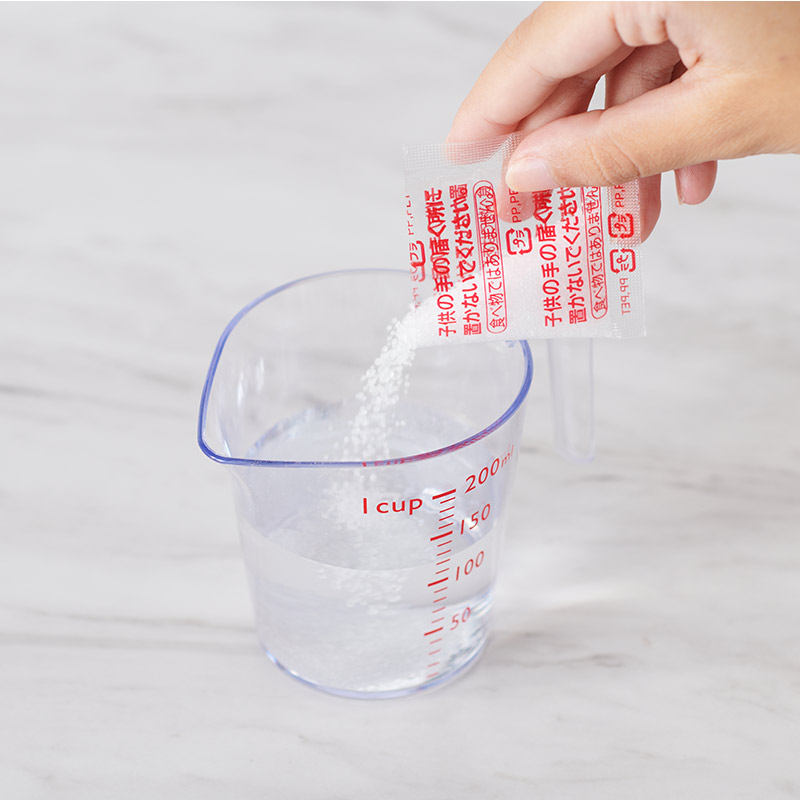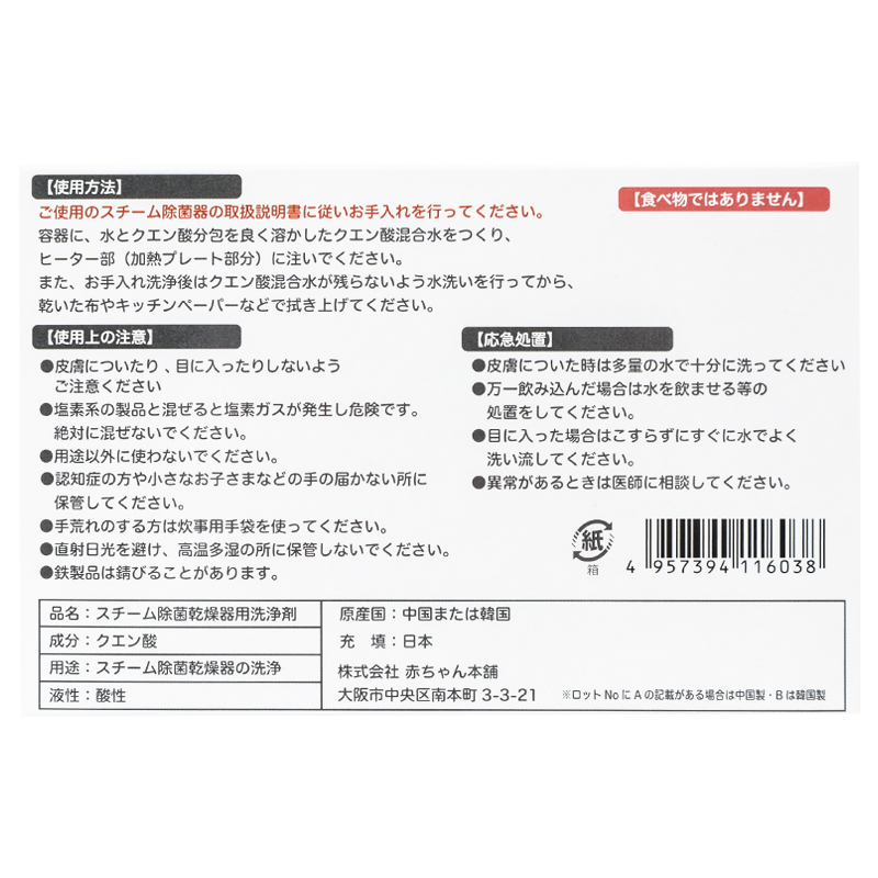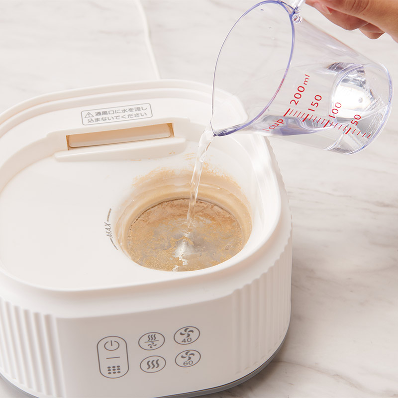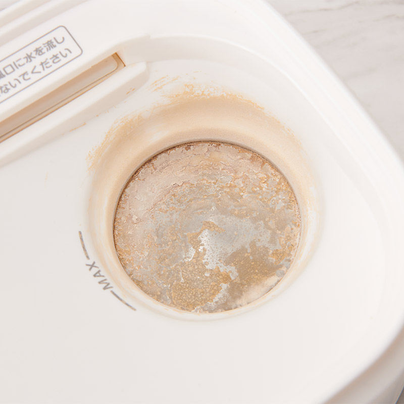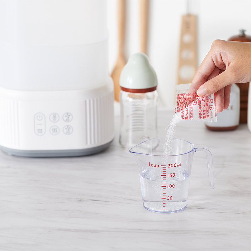 ヒータ部の水あか汚れを落とす! スチーム除菌器のヒーター部(加熱プレート部分)に付着した水あか(アルカリ性の汚れ)をキレイに落とします。 容器に水とクエン酸分包をよく溶かしたクエン酸混合水をつくり、加熱部に注ぎ、お手入れ洗浄後はクエン酸混合水が残らないように水洗いを行ってから乾いた布やキッチンペーパーなどでヒーター部分を拭き上げてください。