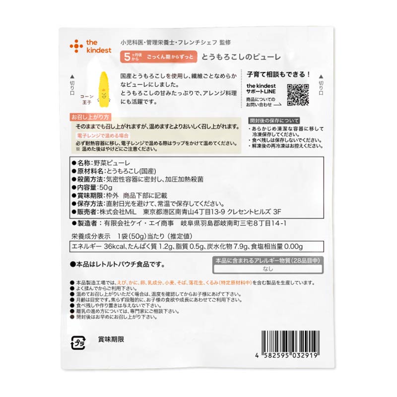 ●とうもろこしのピューレ ●原材料名:とうもろこし(国産) ●内容量:50g ●栄養成分:1個当たり 熱量 36kcal たんぱく質 1.2g 脂質 0.5g 炭水化物 7.9g ナトリウム mg ●開封後はお早めにお召し上がりください。 ●本品製造工場では、えび、かに、卵、乳成分、小麦、そば、落花生、くるみ(特定原材料中)を含む製品を生産しています。