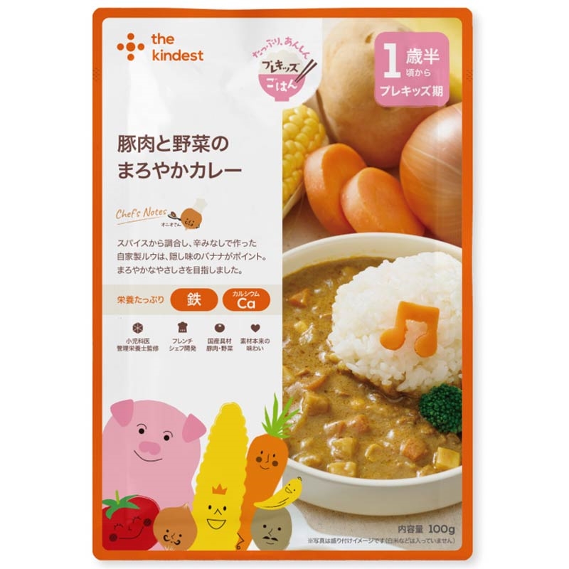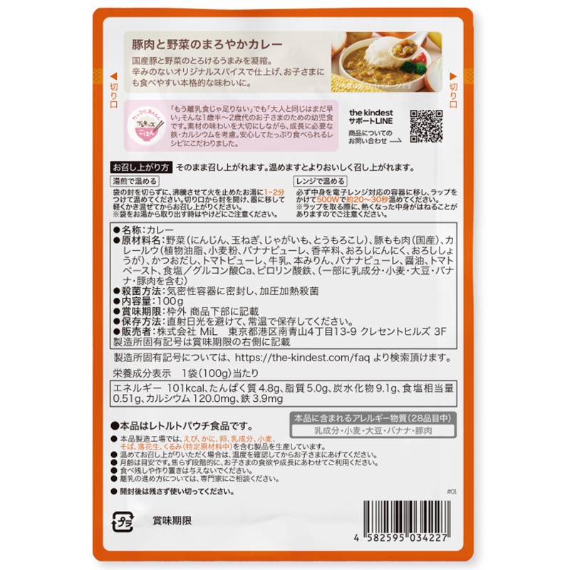 ●カレー ●材料名:野菜(にんじん、玉ねぎ、じゃがいも、とうもろこし)、豚もも肉(国産)、カレールウ(植物油脂、小麦粉、バナナピューレ、香辛料、おろしにんにく、おろししょうが)、かつおだし、トマトピューレ、牛乳、本みりん、バナナピューレ、醤油、トマトペースト、食塩/グルコン酸Ca、ピロリン酸鉄、(一部に乳成分・小麦・大豆・バナナ・豚肉を含む) ●内容量:100g ●栄養成分:1袋当たり 熱量 101kcal たんぱく質 4.8g 脂質 5.0g 炭水化物 9.1g 食塩相当量 0.51g カルシウム 120mg 鉄 3.9mg