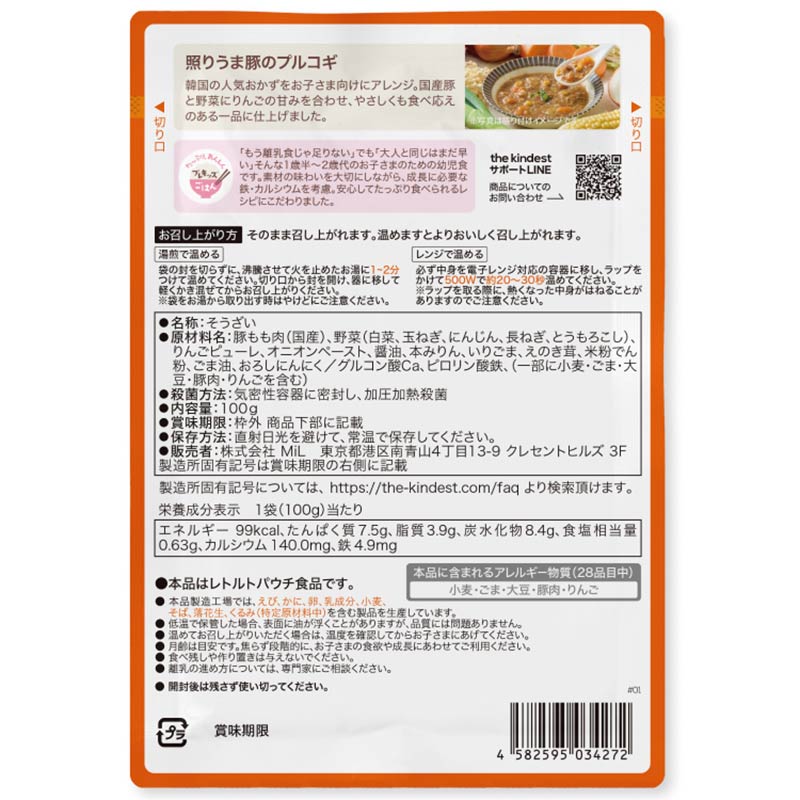 ●そうざい ●原材料名:豚もも肉(国産)、野菜(白菜、玉ねぎ、にんじん、長ねぎ、とうもろこし)、りんごピューレ、オニオンペースト、醤油、本みりん、いりごま、えのき茸、米粉でん粉、ごま油、おろしにんにく/グルコン酸Ca、ピロリン酸鉄、(一部に小麦・ごま・大豆・豚肉・りんごを含む) ●内容量:100g ●栄養成分:1袋当たり 熱量 99kcal たんぱく質 7.5g 脂質 3.9g 炭水化物 8.4g 食塩相当量 0.63g カルシウム 140mg 鉄 4.9mg