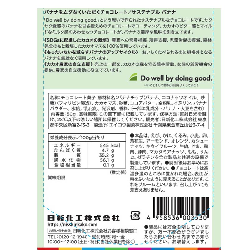 ●チョコレート菓子 ●原材料名:バナナチップ(バナナ、ココナッツオイル、砂糖)(フィリピン製造)、カカオマス、砂糖、ココアバター、全粉乳、イヌリン、バナナパウダー、水飴/乳化剤、光沢剤、香料、(一部に乳成分・バナナ・大豆を含む) ●内容量:50g ●栄養成分:100gあたり 熱量 545kcal たんぱく質 4.7g 脂質 35.2g 炭水化物 56.1g 食塩相当量 0.1g