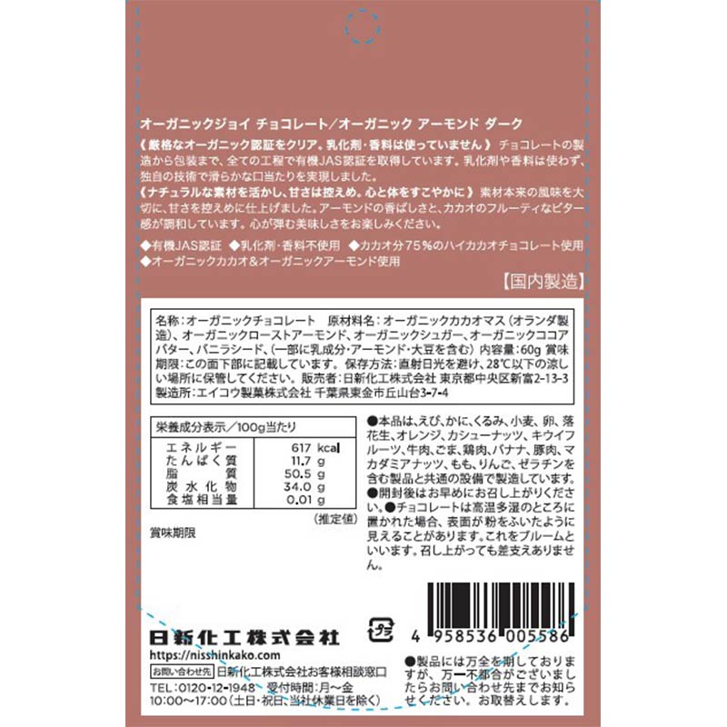 ●オーガニックチョコレート ●原材料名:オーガニックカカオマス(オランダ製造)、オーガニックローストアーモンド、オーガニックシュガー、オーガニックココアバター、バニラシード、(一部に乳成分・アーモンド・大豆を含む) ●内容量:60g ●栄養成分:100gあたり 熱量 617kcal たんぱく質 11.7g 脂質 50.5g 炭水化物 34.0g 食塩相当量 0.01g