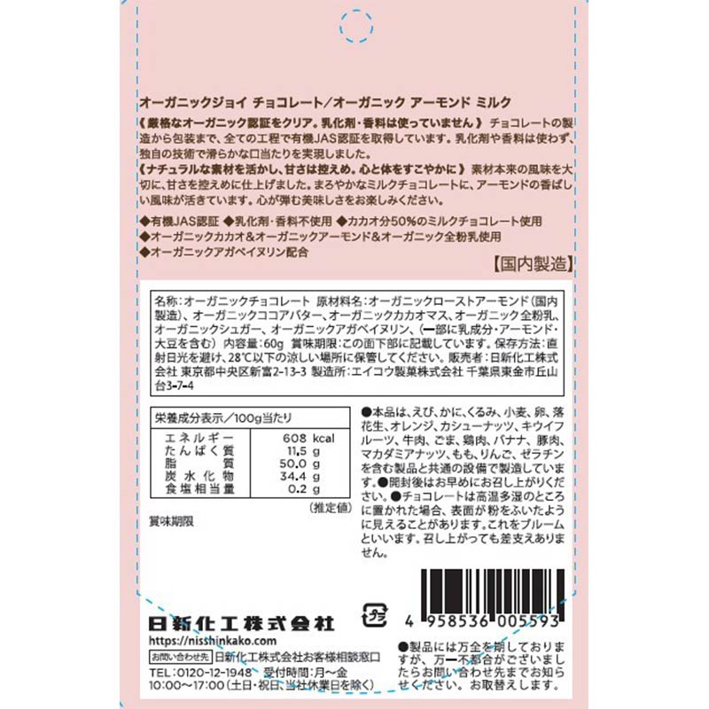 ●オーガニックチョコレート ●原材料名:オーガニックローストアーモンド(国内製造)、オーガニックココアバター、オーガニックカカオマス、オーガニック全粉乳、オーガニックシュガー、オーガニックアガベイヌリン、(一部に乳成分・アーモンド・大豆を含む) ●内容量:60g ●栄養成分:100gあたり 熱量 608kcal たんぱく質 11.5g 脂質 50.0g 炭水化物 34.4g 食塩相当量 0.2g