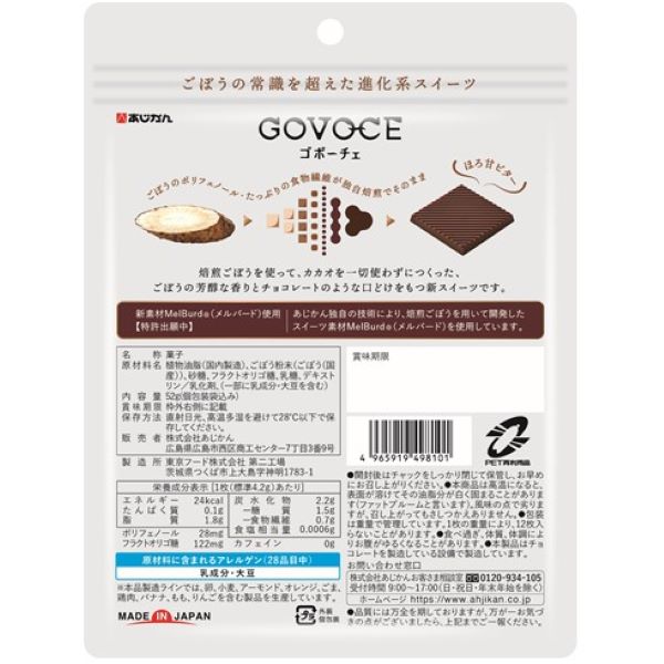 ●菓子 ●原材料名:植物油脂(国内製造)、ごぼう粉末(ごぼう(国産))、砂糖、フラクトオリゴ糖、乳糖、デキストリン/乳化剤、(一部に乳成分・大豆を含む) ●内容量:52g(個包装袋込み) ●栄養成分:1枚(標準4.2g)あたり 熱量 24kcal たんぱく質 0.1g 脂質 1.8g 炭水化物 2.2g 食塩相当量 0.0006g 糖質 1.5g 食物繊維 0.7g ポリフェノール 28mg フラクトオリゴ糖 122mg カフェイン 0g