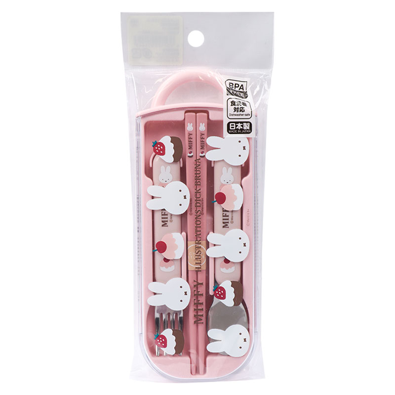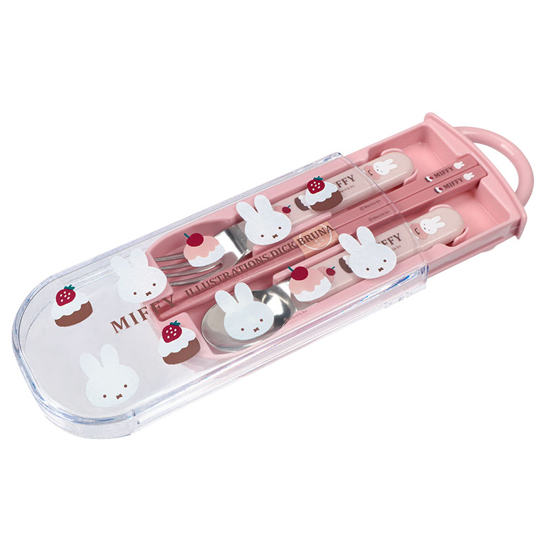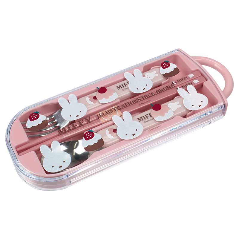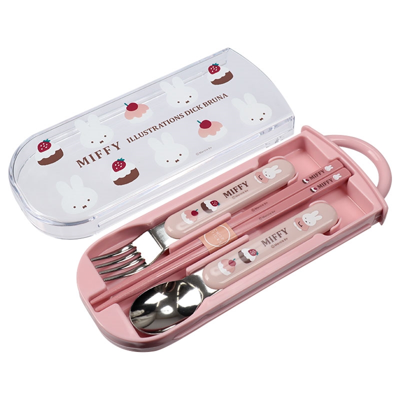 箸・スプーン・フォークがセットになった食洗機対応のトリオセット。 ミッフィーとケーキの柄が入った、箸・スプーン・フォークがセットになった食洗機対応のトリオセットです。 ハンドル付で開閉しやすいスライド式のケース♪ 持ち運びしやすい軽量タイプです。 (c)Mercis bv