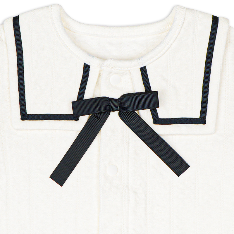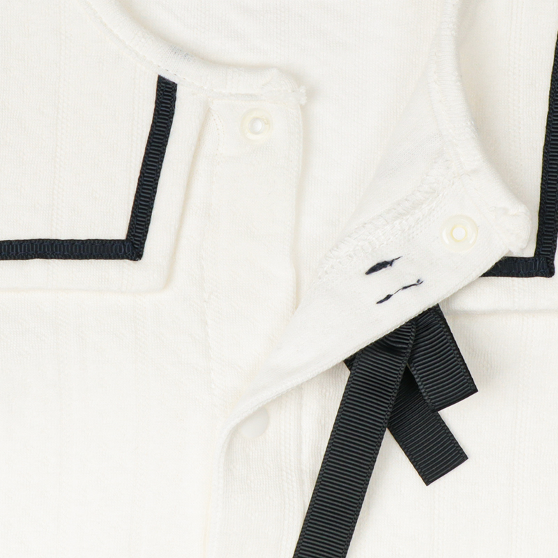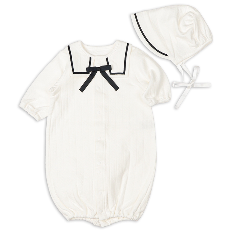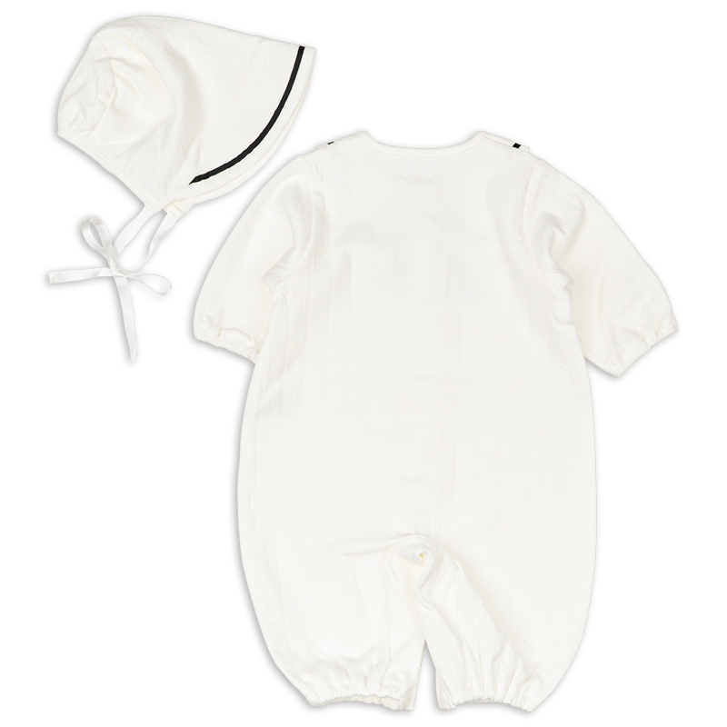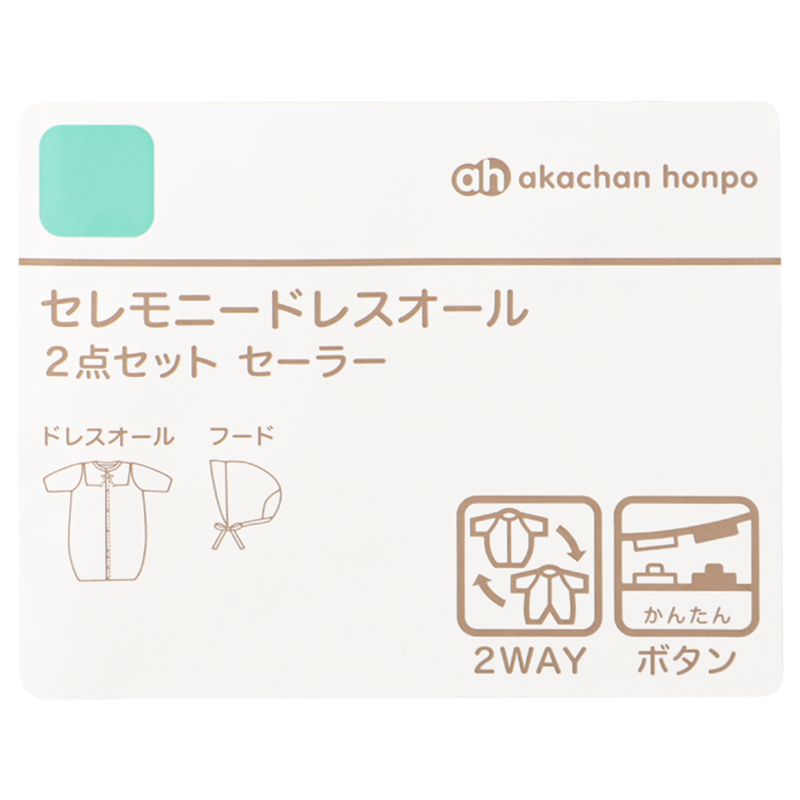 セーラー衿がかわいいドレスオールとフードがセットのセレモニードレスセットです。 退院時やお宮参り、お披露目等の赤ちゃんの特別な日におすすめです。 ドレスオール股部分のホックは留め間違い防止のためにカラーを換えています。