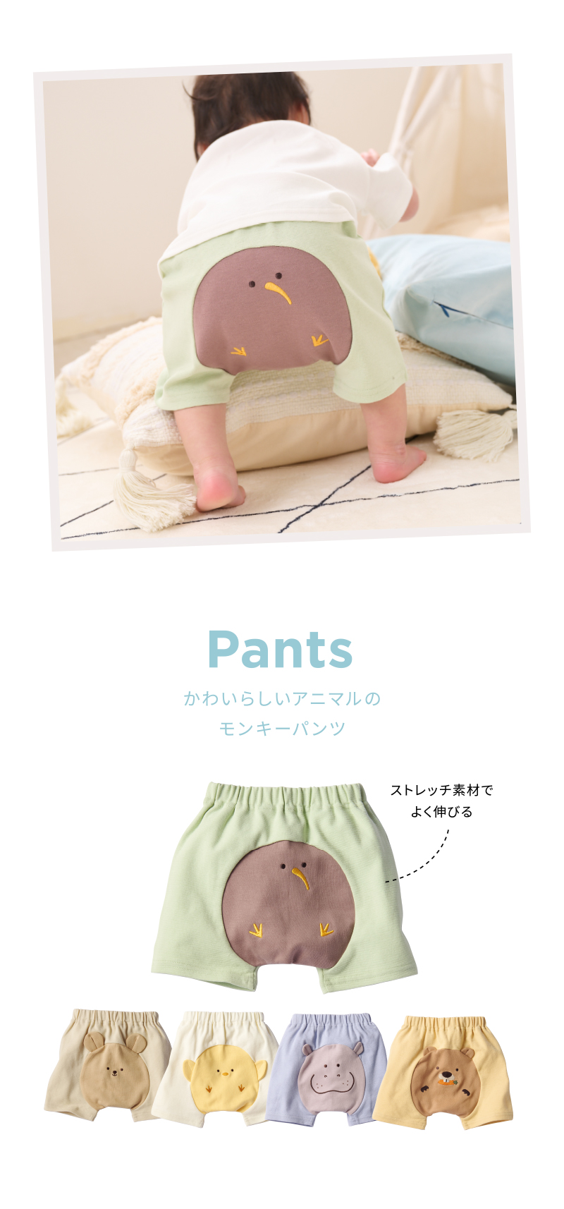 ストレッチのある生地を使用したパンツです。 おしり部分にはアニマルのモチーフがあり ハイハイや歩いている時により可愛くなる商品です。 着用の際、窮屈感がなくお子様に負担をかけず動きやすいパンツです。