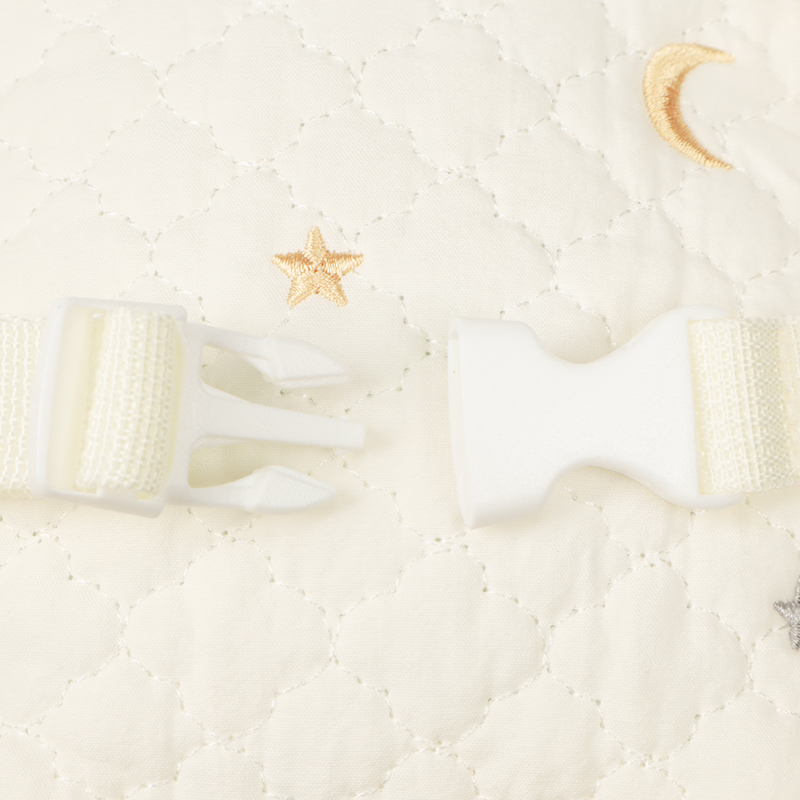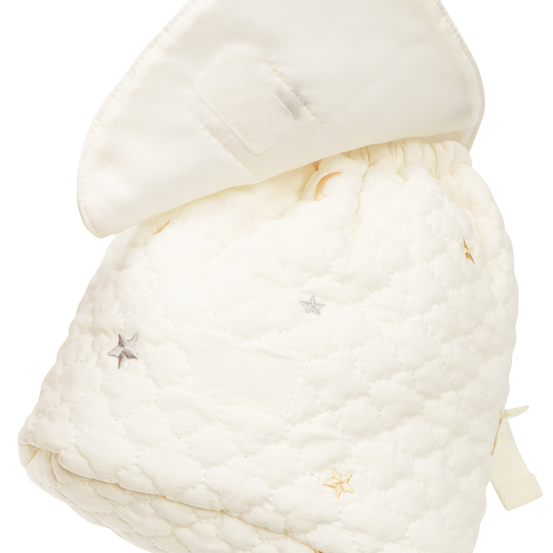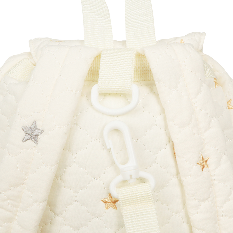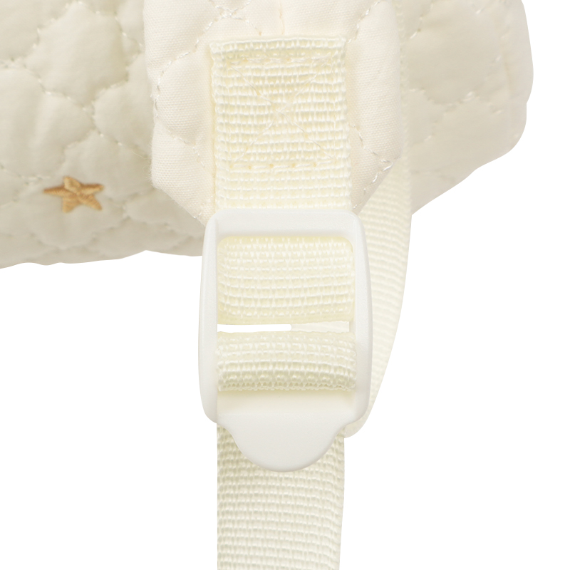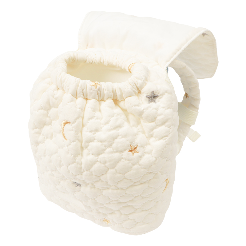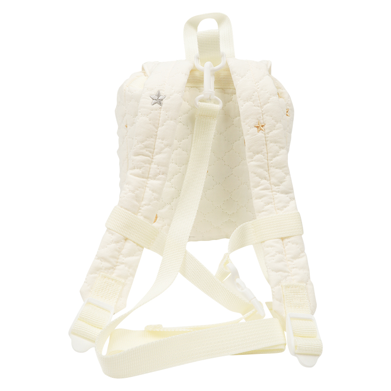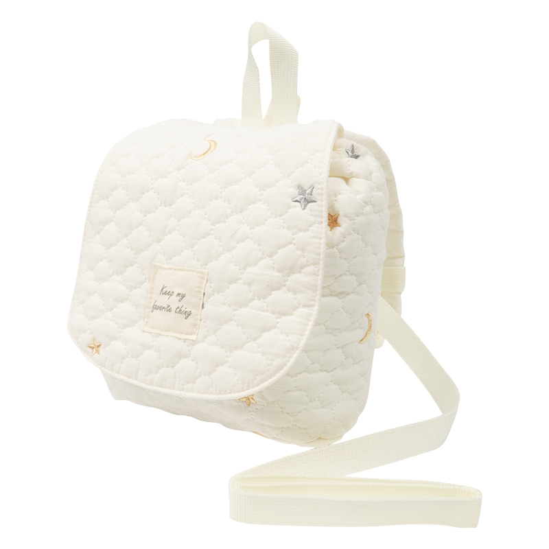 韓国発のキルティング素材“イブル”を使用したリュックサックです。 総柄刺しゅう入りでシンプルながらもかわいらしいデザインで、通園通学やお出かけにおすすめです。袋口はゴムになっているため、中身が落ちにくい仕様になっています。迷子紐付き。