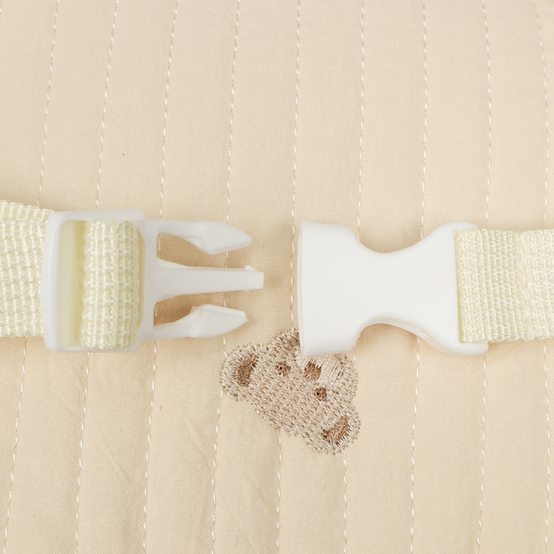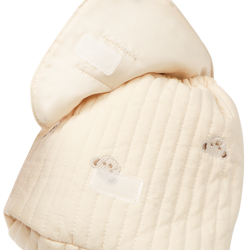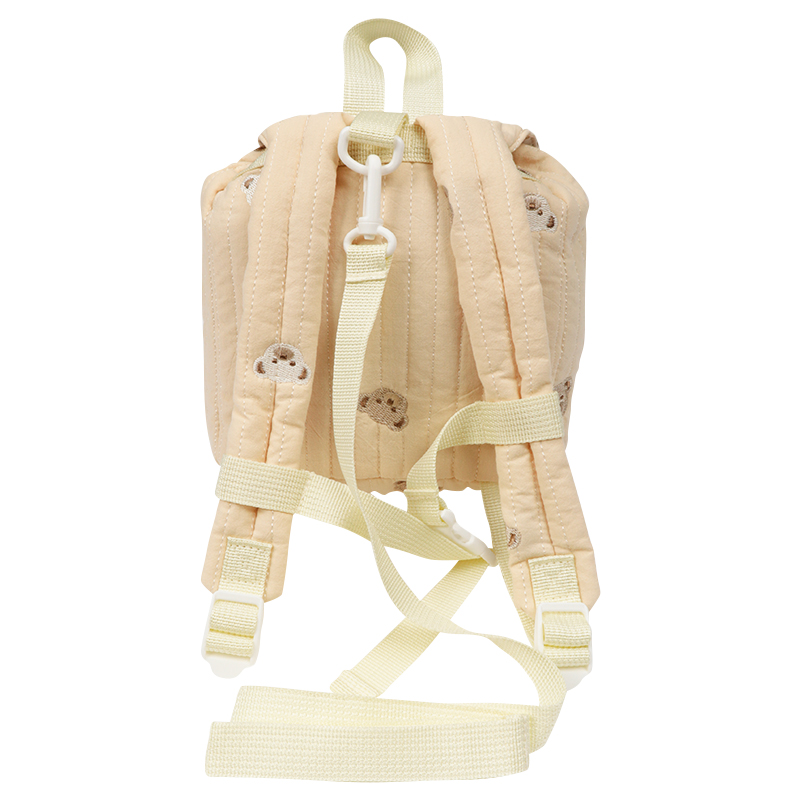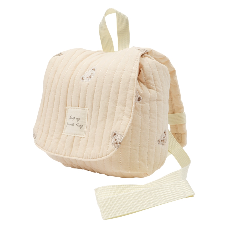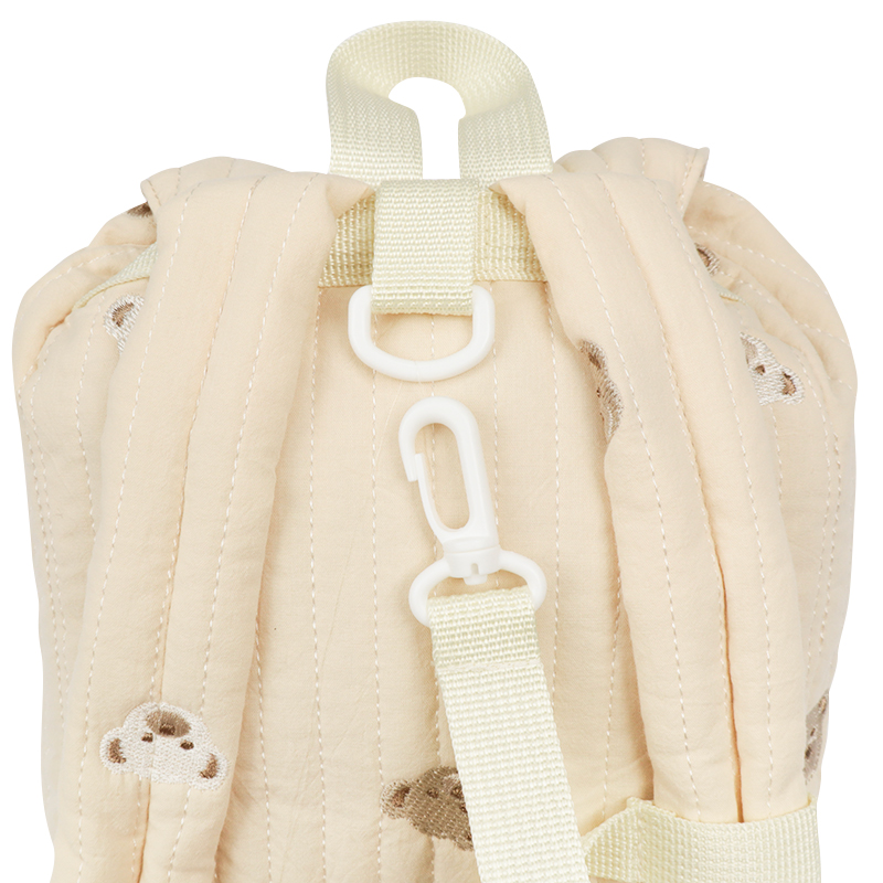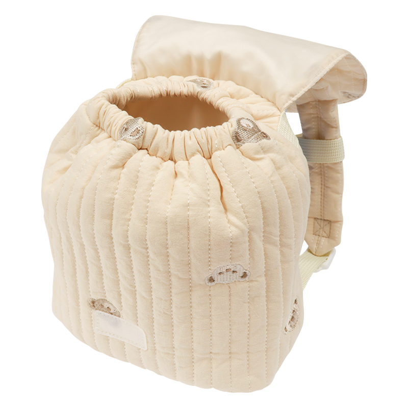 韓国発のキルティング素材“イブル”を使用したリュックサックです。 総柄刺しゅう入りでシンプルながらもかわいらしいデザインで、通園通学やお出かけにおすすめです。 袋口はゴムになっているため、中身が落ちにくい仕様になっています。迷子紐付き。