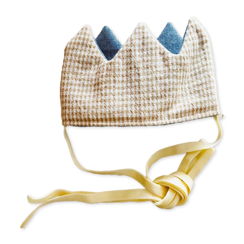 ベビー用の王冠ヘッドアクセサリー。 初めてのおめかしは肌に優しいアイテムを使いたい、 そんなママたちが考えて作ったベビーのお祝いグッズ ベージュのギンガムチェックにデニム生地のリバーシブル仕様。 紐の結び目でサイズの調節ができます。
