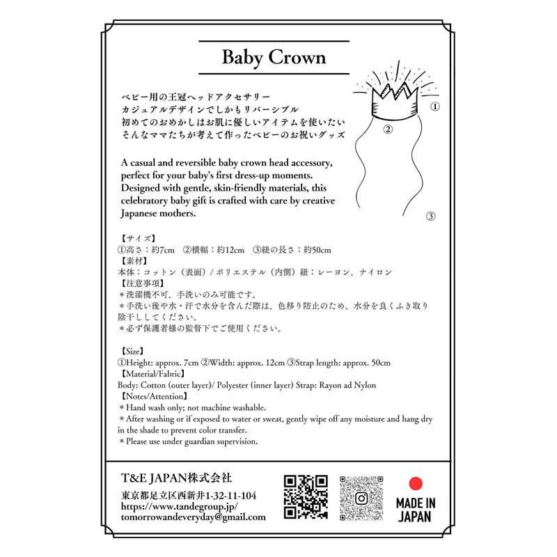 ●サイズ(約・cm):[王冠部分]高さ7cm×横幅12cm [紐の長さ]50cm ●素材: [本体]コットン(表面)・ポリエステル(内側) [紐]レーヨン・ナイロン ●手洗いのみ可能(洗濯機不可)