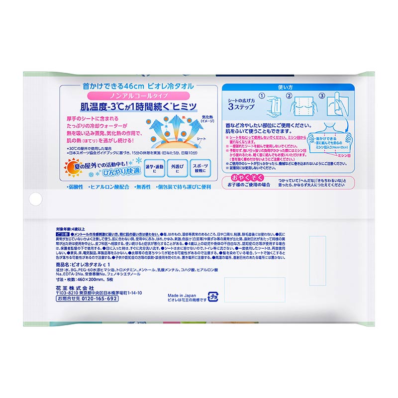 ●内容量:個装(1枚入)×5包 ●タオルサイズ:460㎜×200㎜ ●成分:成分:水、BG、PEG-60水添ヒマシ油、トロメタミン、メントール、乳酸メンチル、コハク酸、ヒアルロン酸Na、EDTA-2Na、安息香酸Na、フェノキシエタノール