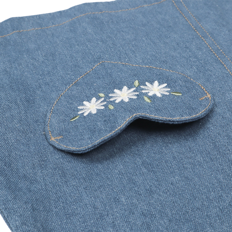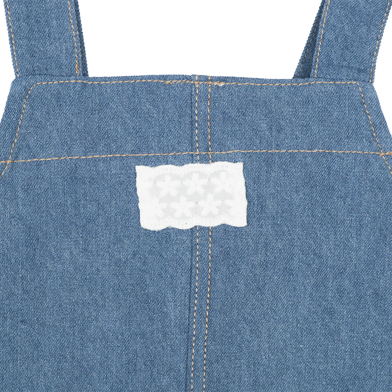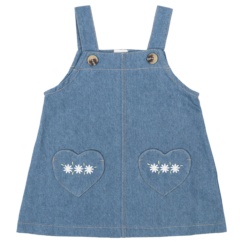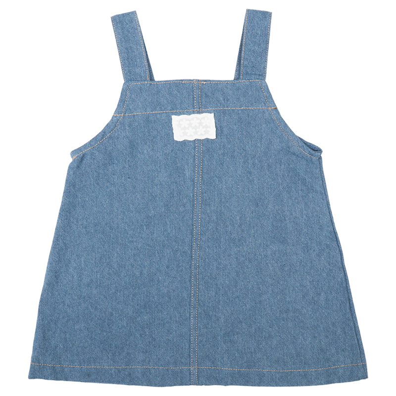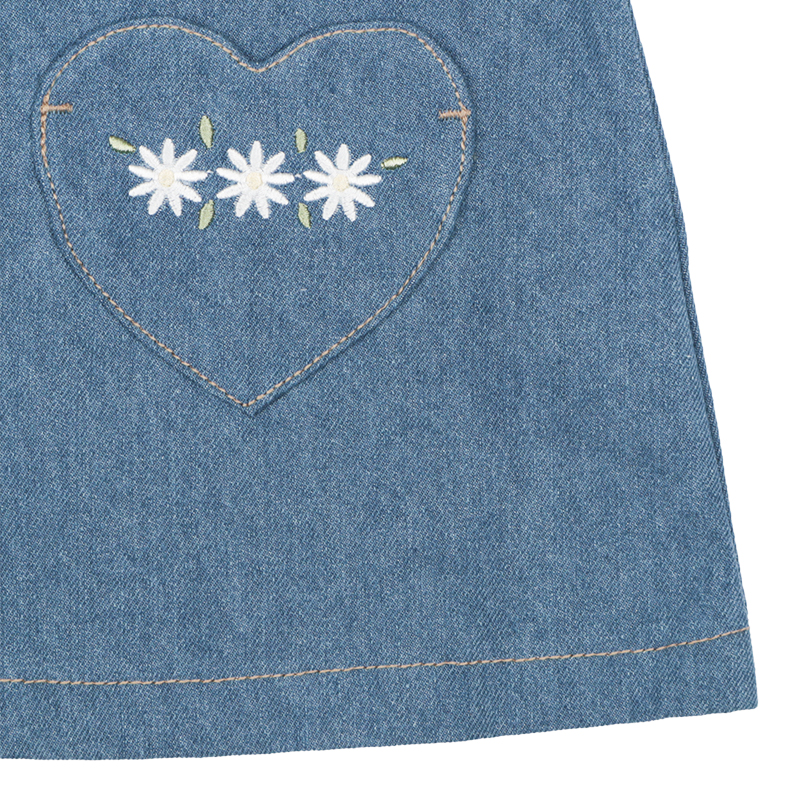 ハート型ポケットと刺繍がポイントのジャンパースカートです。 肩紐の巾が広めのベーシックな形、デニムと程よい厚さの布帛生地の展開で、長袖Tシャツ、半袖Tシャツ等、組合せにより年間着用できます。 名前が書けるお名前タグ付きです。名前が書けるお名前タグ付きです。