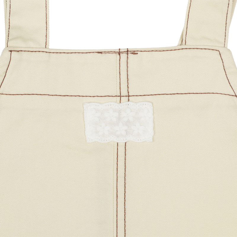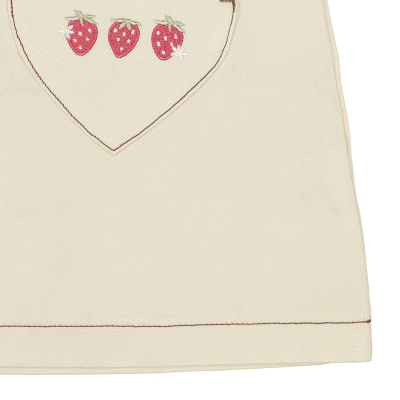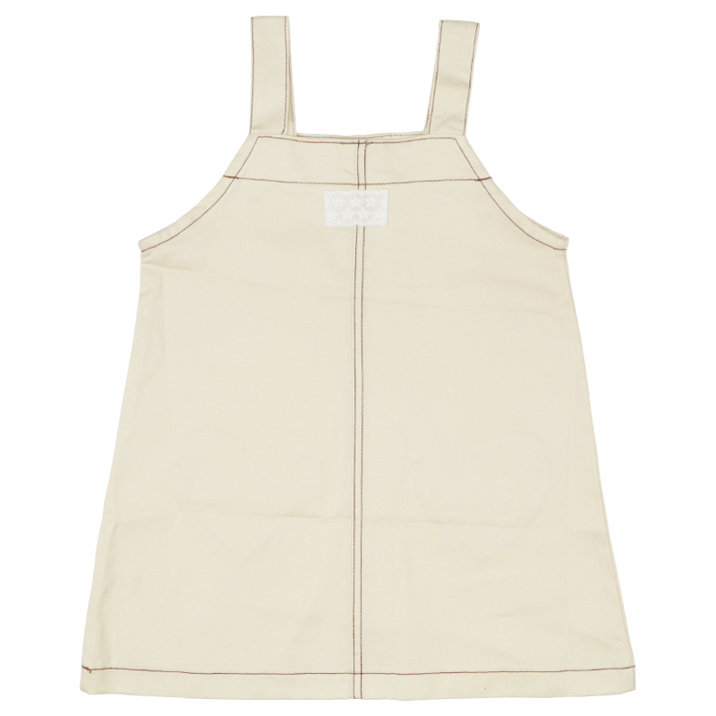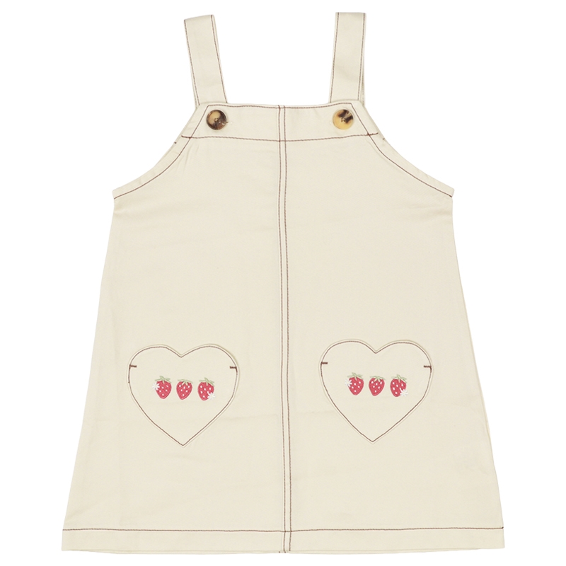 ハート型ポケットと刺繍がポイントのジャンパースカートです。 肩紐の巾が広めのベーシックな形、デニムと程よい厚さの布帛生地の展開で、長袖Tシャツ、半袖Tシャツ等、組合せにより年間着用できます。 名前が書けるお名前タグ付きです。
