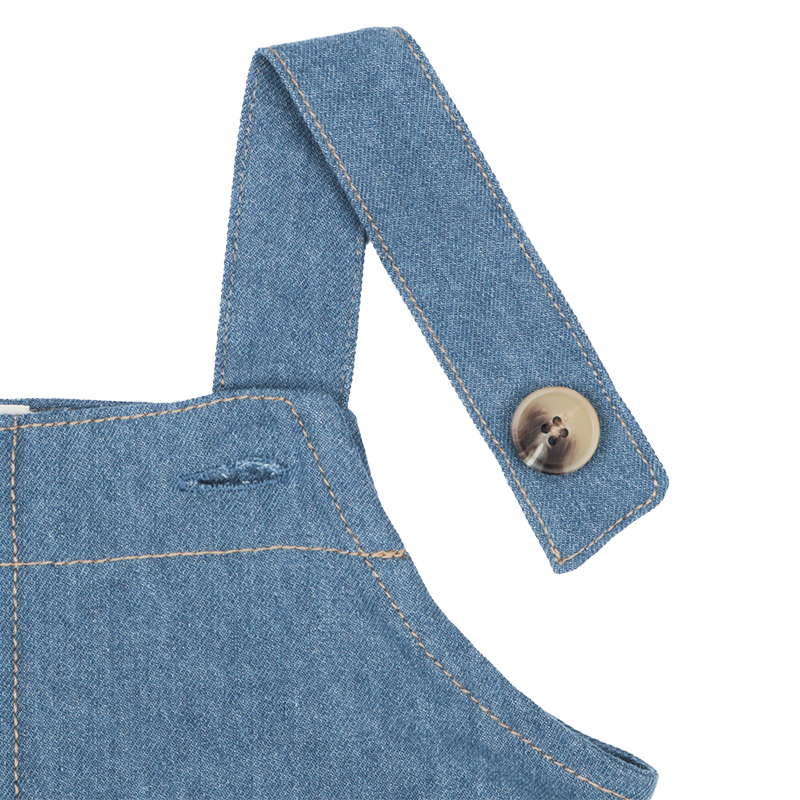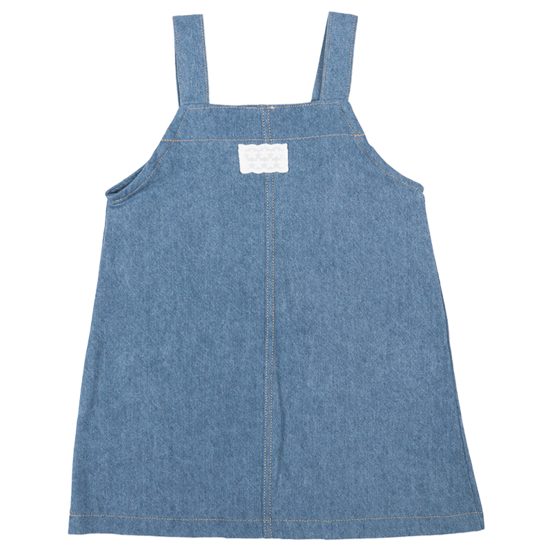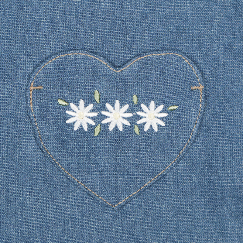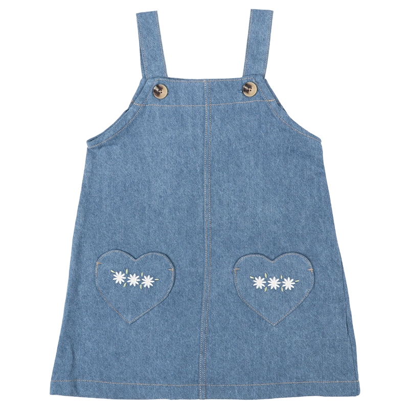 ハート型ポケットと刺繍がポイントのジャンパースカートです。 肩紐の巾が広めのベーシックな形、デニムと程よい厚さの布帛生地の展開で、長袖Tシャツ、半袖Tシャツ等、組合せにより年間着用できます。 名前が書けるお名前タグ付きです。