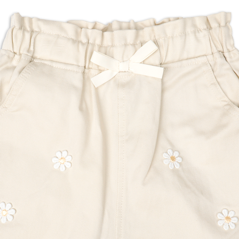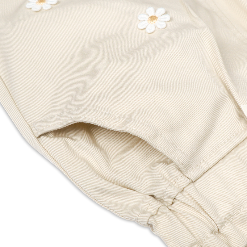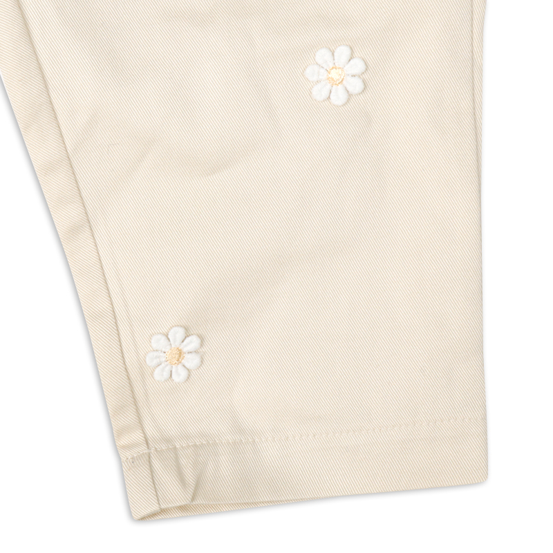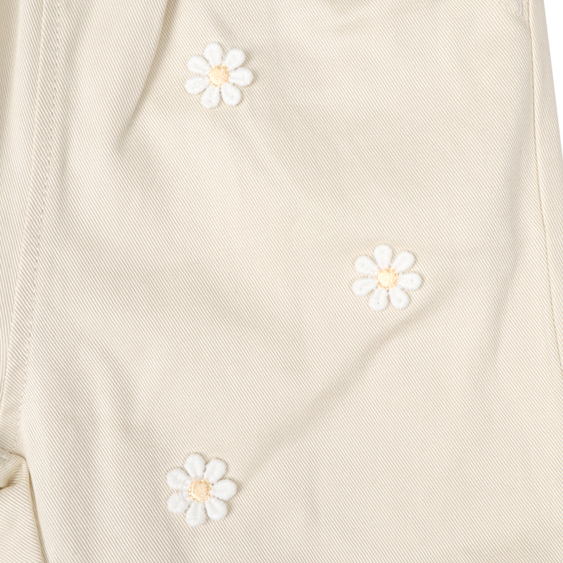 足の部分にちりばめた、お花のモチーフがポイントの、10分丈パンツです。程よい厚みのデニムと布帛生地を使用しているので、色々なシーズンで活躍。ベーシックなカラーなので、色々なトップスとの相性も良く、便利な1枚です。名前が書けるお名前タグ付きです。