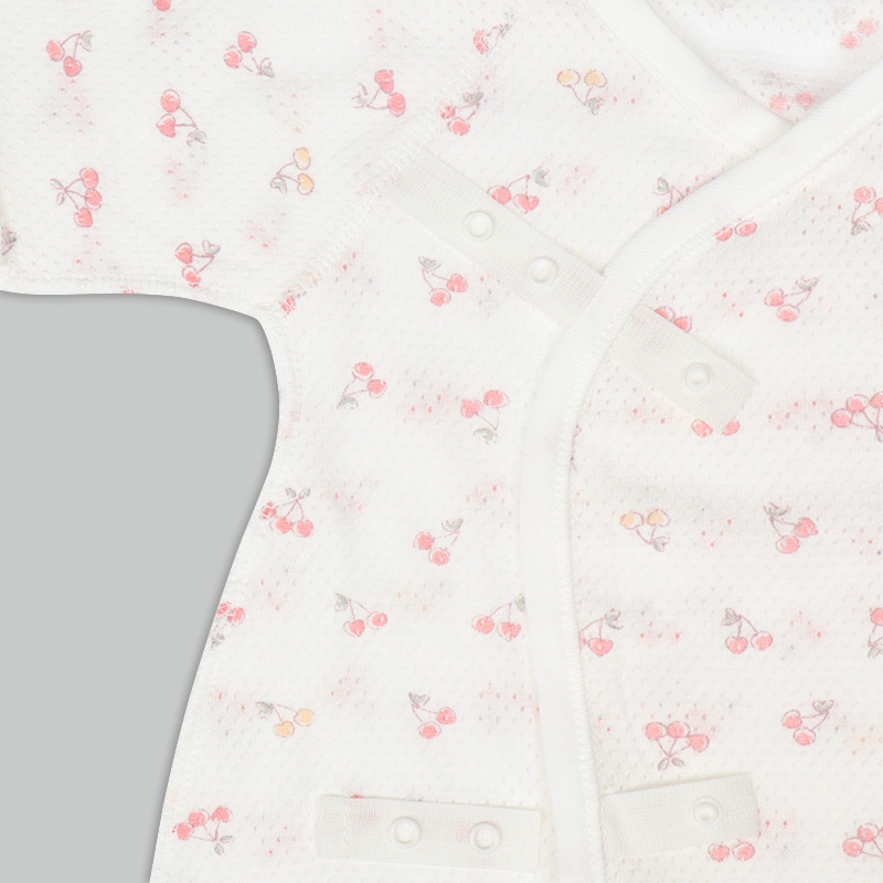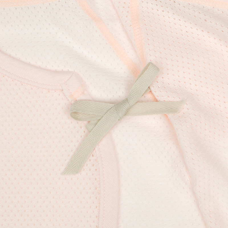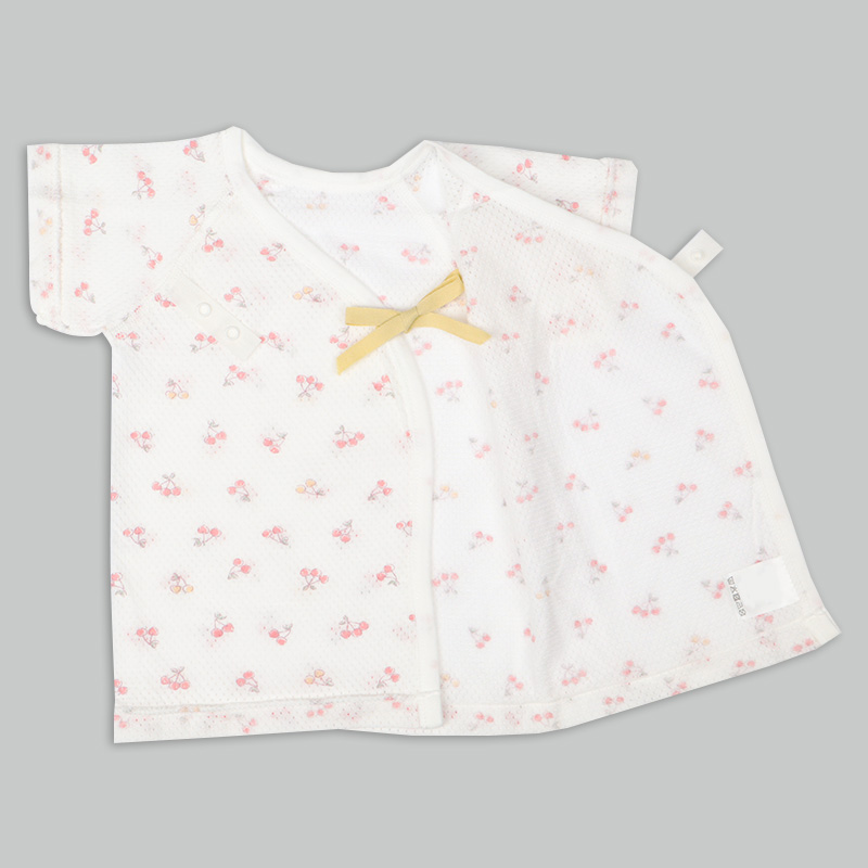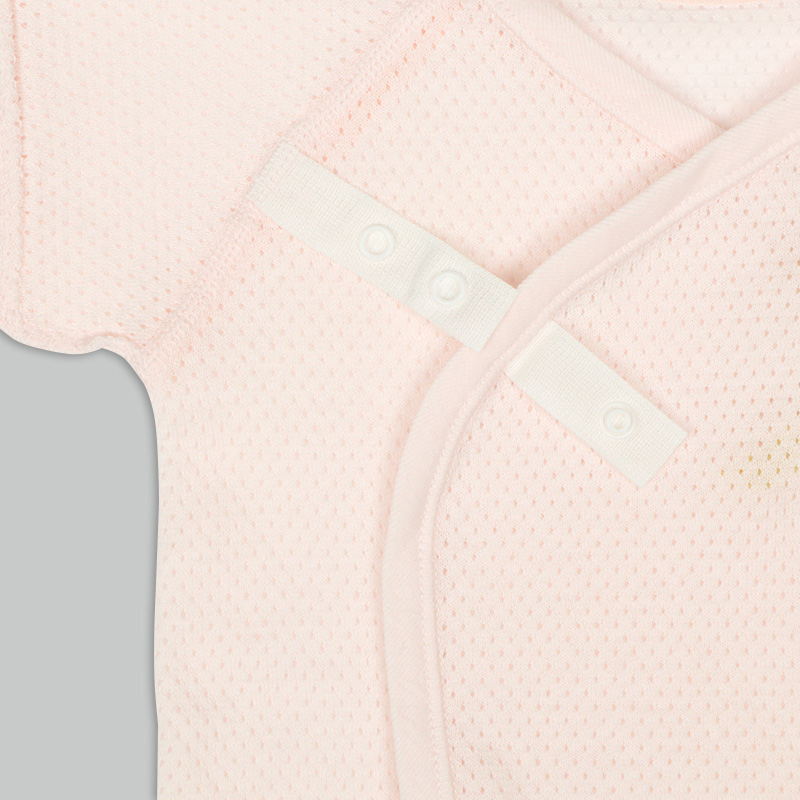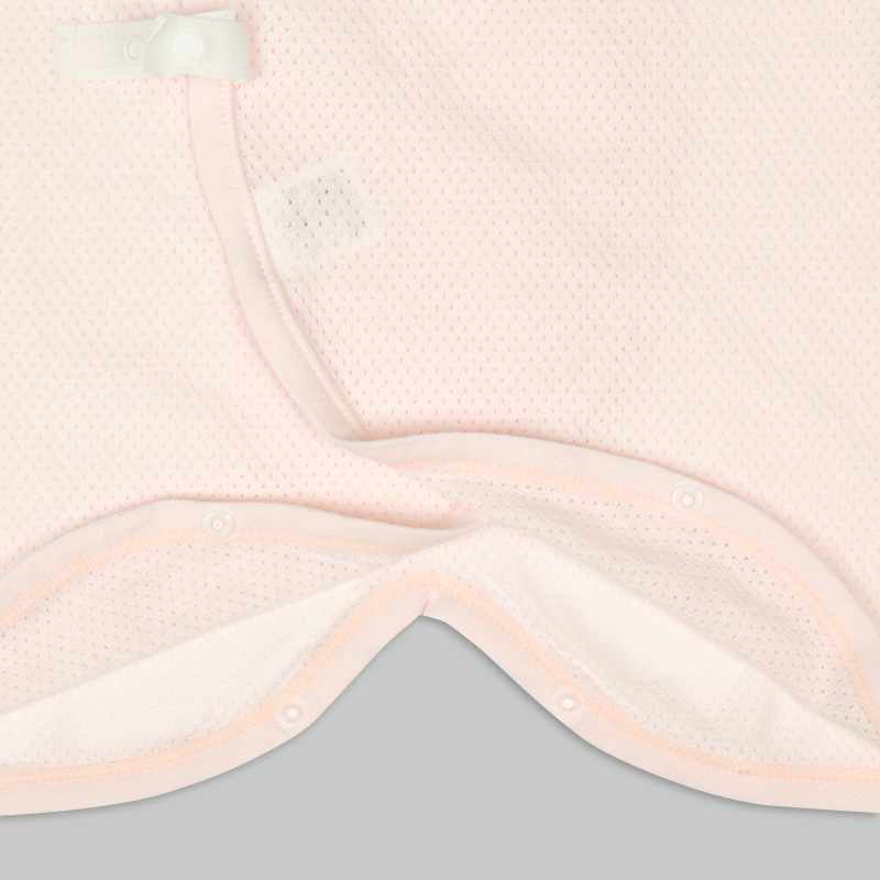 通気性の良い綿100%のメッシュ生地を使用。 縫いしろは赤ちゃんの肌に直接あたらないやさしい仕様。 外側はスナップタイプでお着替え簡単。 内側はひもタイプで調節可能、肌当たりもやさしいです。 春から夏生まれの赤ちゃんにおすすめの素材です。