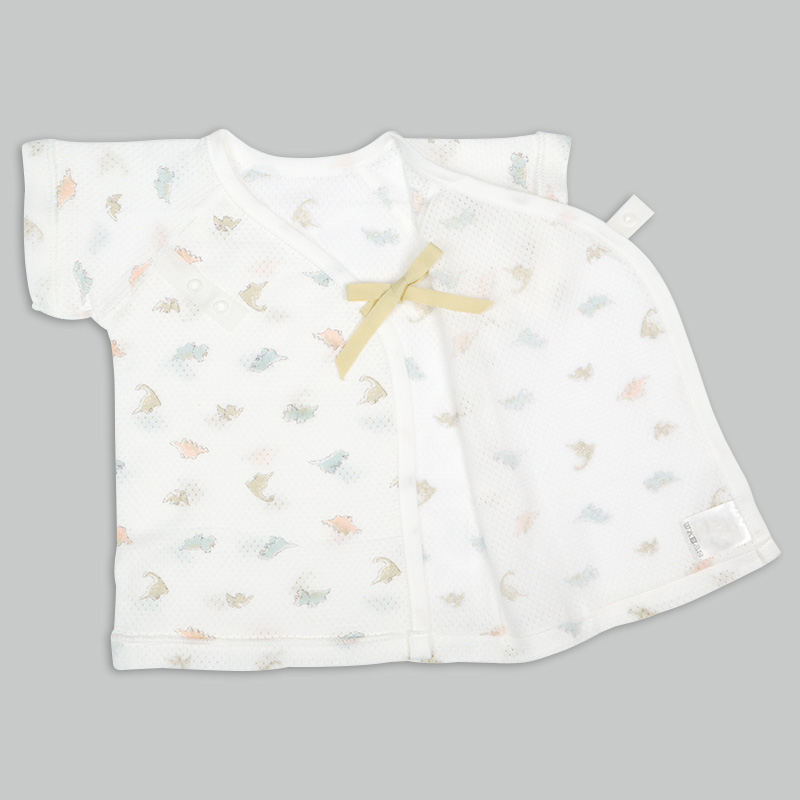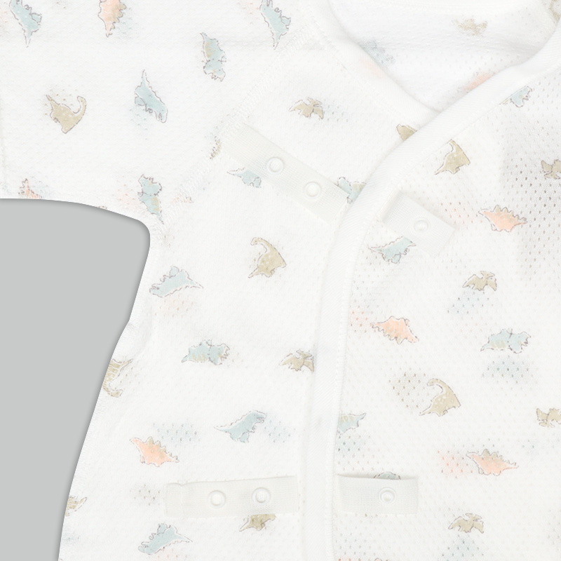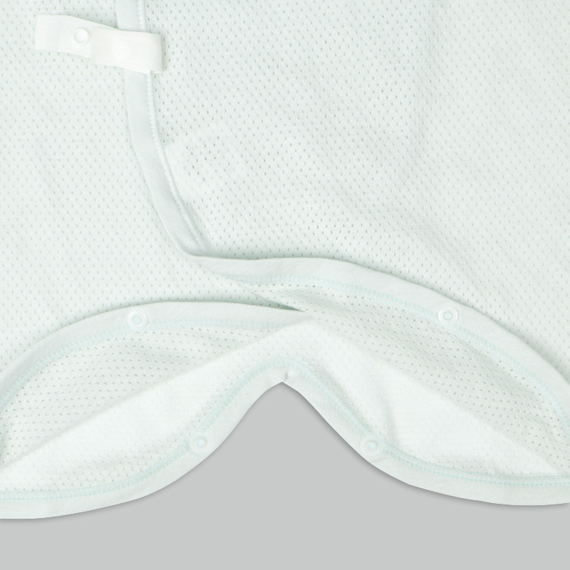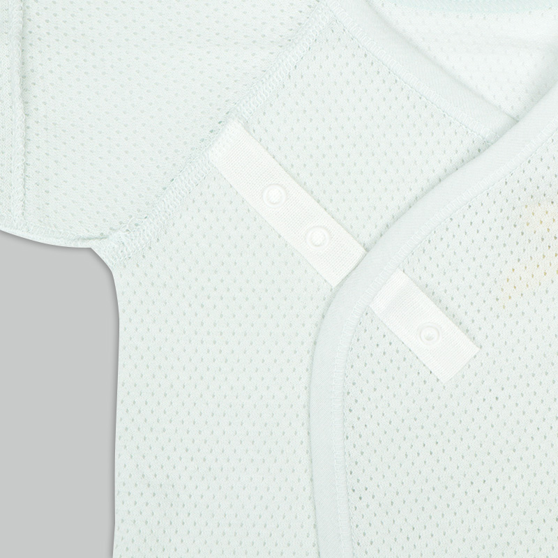通気性の良い綿100%のメッシュ生地を使用。 縫いしろは赤ちゃんの肌に直接あたらないやさしい仕様。 外側はスナップタイプでお着替え簡単。 内側はひもタイプで調節可能、肌当たりもやさしいです。 春から夏生まれの赤ちゃんにおすすめの素材です。