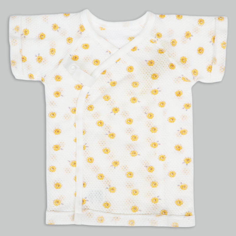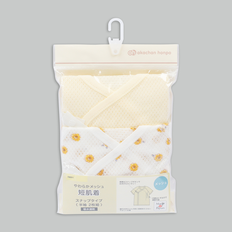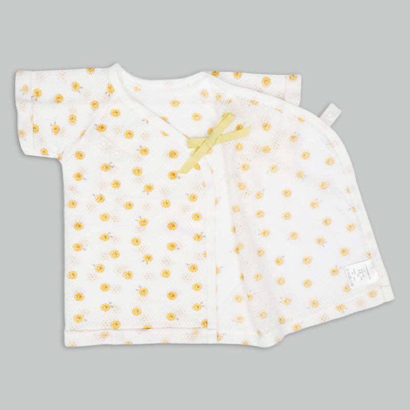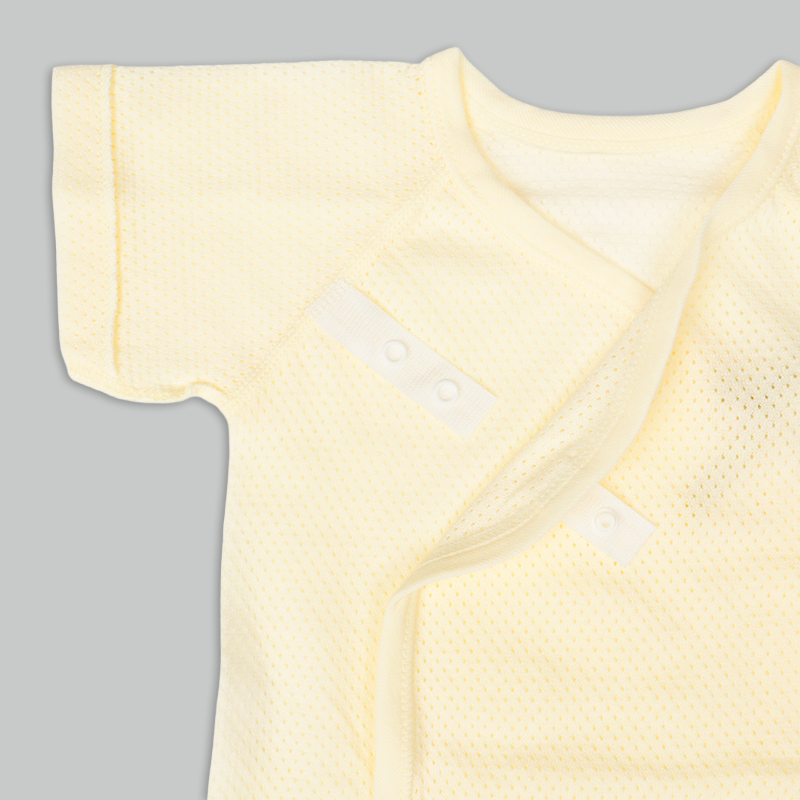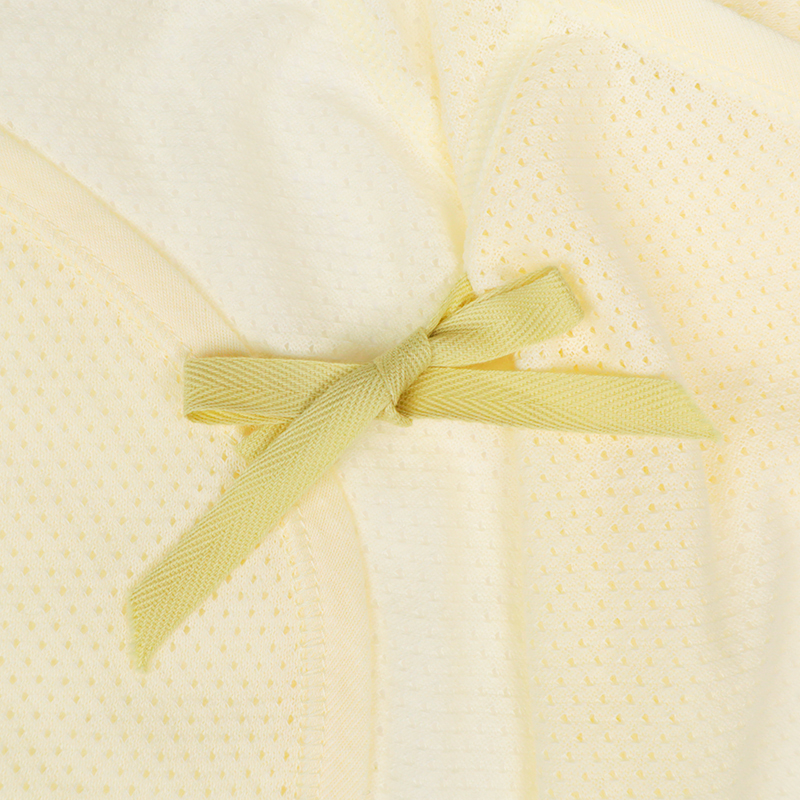 通気性の良い綿100%のメッシュ生地を使用。 縫いしろは赤ちゃんの肌に直接あたらないやさしい仕様。 外側はスナップタイプでお着替え簡単。 内側はひもタイプで調節可能、肌当たりもやさしいです。 春から夏生まれの赤ちゃんにおすすめの素材です。