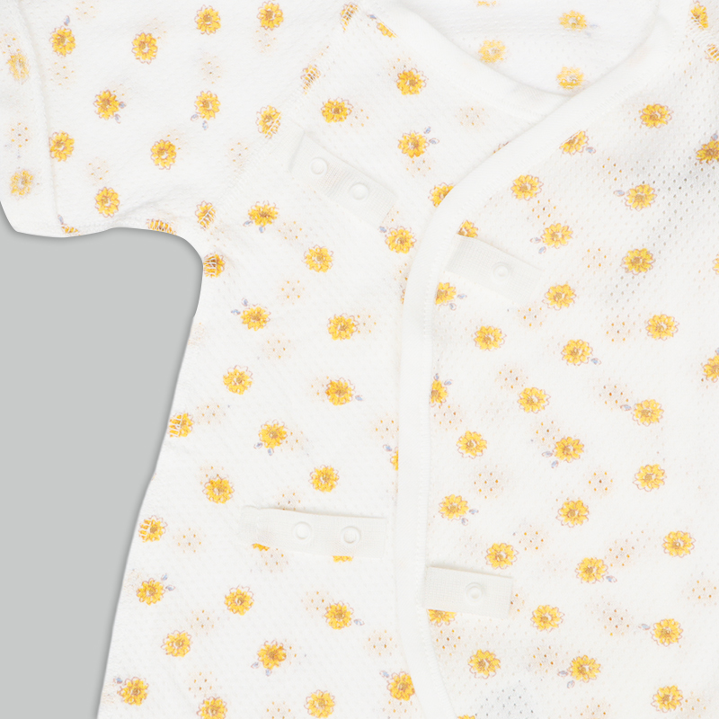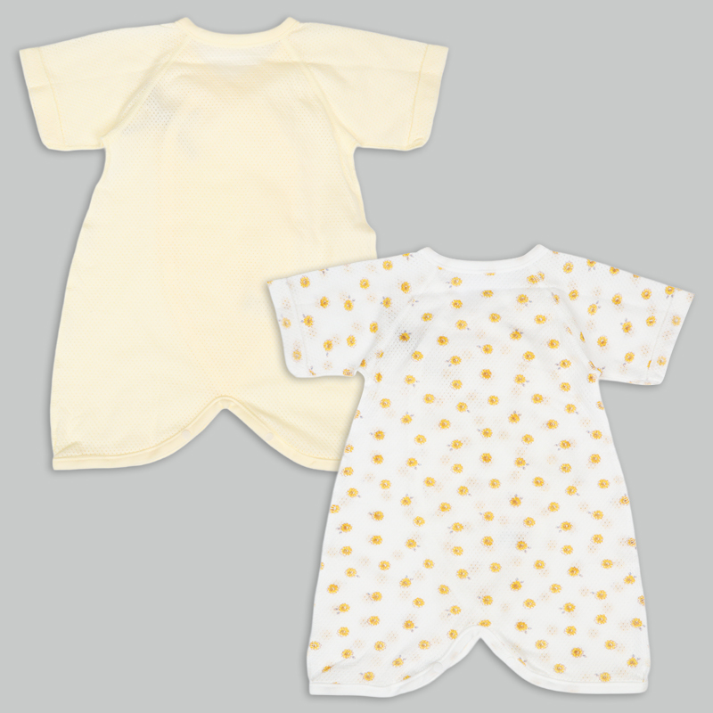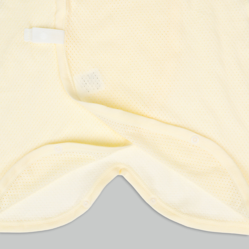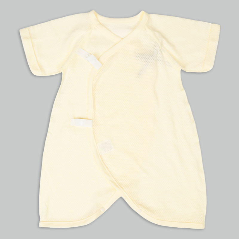 通気性の良い綿100%のメッシュ生地を使用。 縫いしろは赤ちゃんの肌に直接あたらないやさしい仕様。 外側はスナップタイプでお着替え簡単。 内側はひもタイプで調節可能、肌当たりもやさしいです。 春から夏生まれの赤ちゃんにおすすめの素材です。