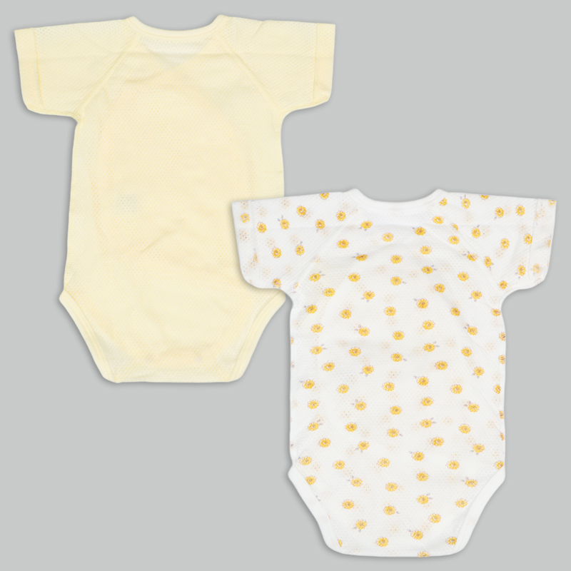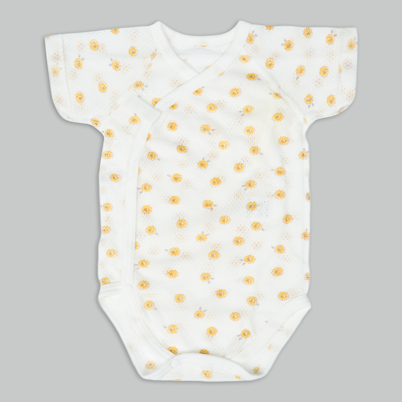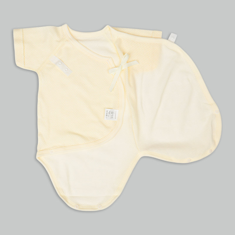 通気性の良い綿100%のメッシュ生地を使用。 縫いしろは赤ちゃんの肌に直接あたらないやさしい仕様。 外側はスナップタイプでお着替え簡単。 内側はひもタイプで調節可能、肌当たりもやさしいです。 春から夏生まれの赤ちゃんにおすすめの素材です。