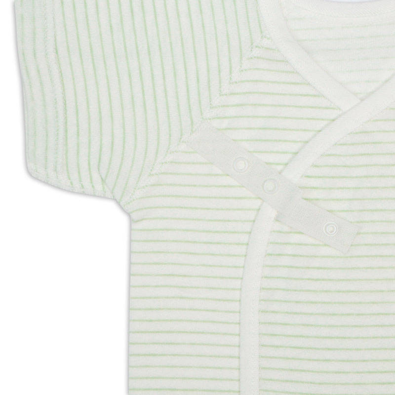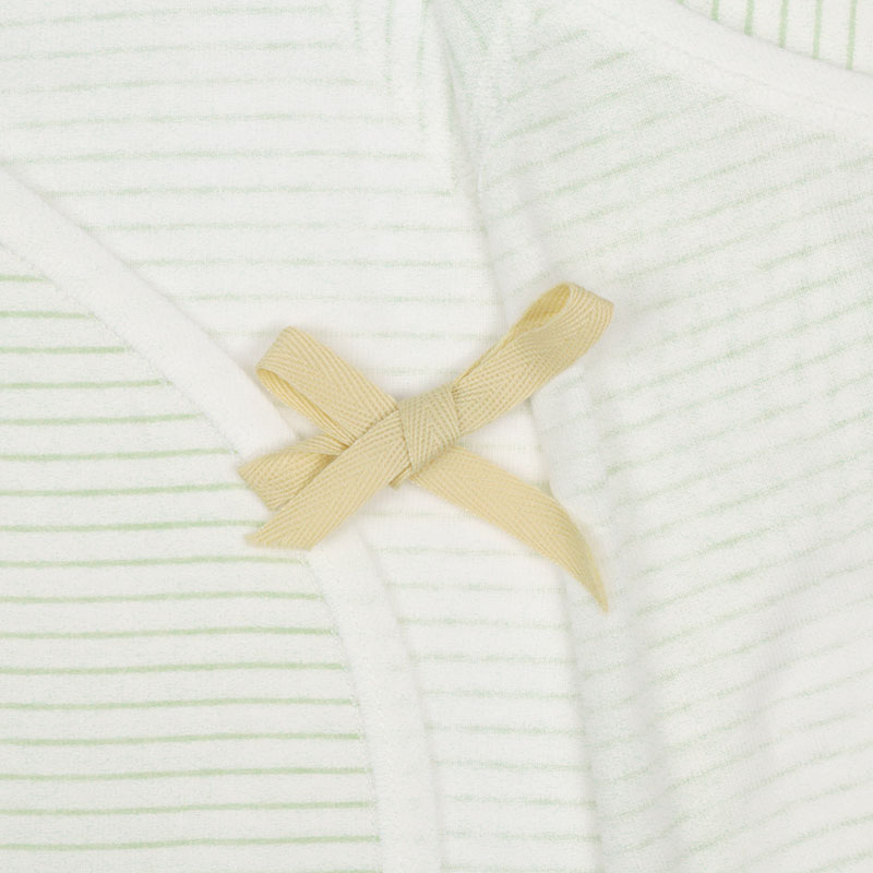 肌触りの良い綿100%のフライス生地を使用。 縫いしろは赤ちゃんの肌に直接あたらないやさしい仕様。 外側はスナップタイプでお着替え簡単。 内側はひもタイプで調節可能、肌当たりもやさしいです。 一年を通してご使用いただける素材です。