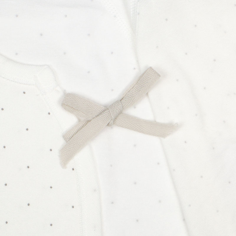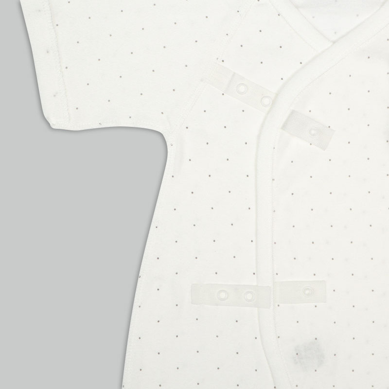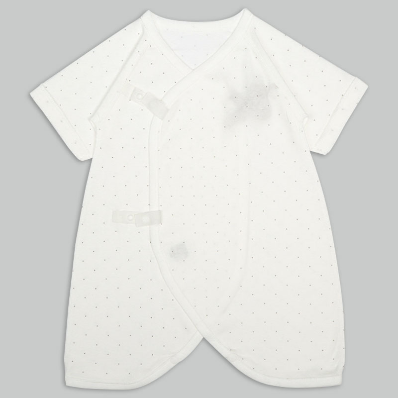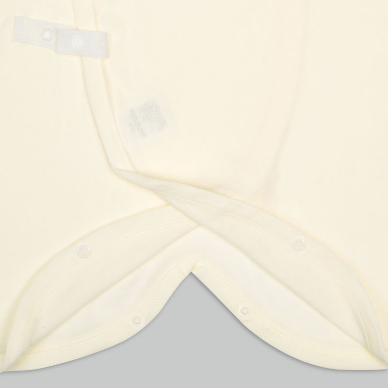 肌触りの良い綿100%のフライス生地を使用。 縫いしろは赤ちゃんの肌に直接あたらないやさしい仕様。 外側はスナップタイプでお着替え簡単。 内側はひもタイプで調節可能、肌当たりもやさしいです。 一年を通してご使用いただける素材です。